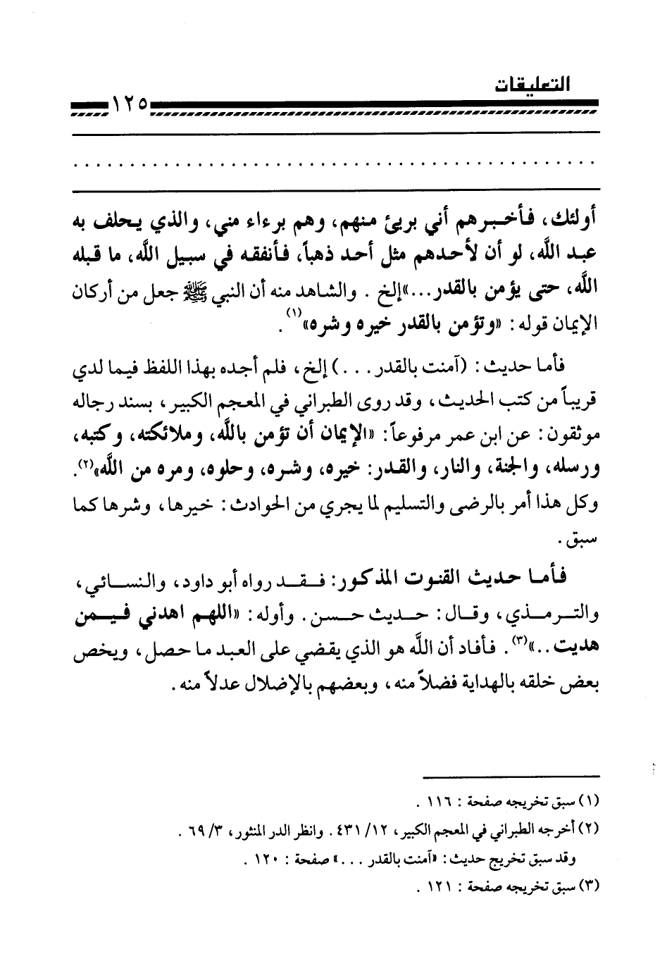 «أولئك، فأخبرهم أني براء منهم، وهم برءاء مني، والذي يحلف به عبد الله لو أن لأحدهم مثل أحد ذهبا، فأنفقه في سبيل الله، ما قبله الله منه حتى يؤمن بالقدر.» إلخ. والشاهد منه أن النبي صلى الله عليه وسلم جعل من أركان الإيمان قوله: «وتؤمن بالقدر خيره وشره» .