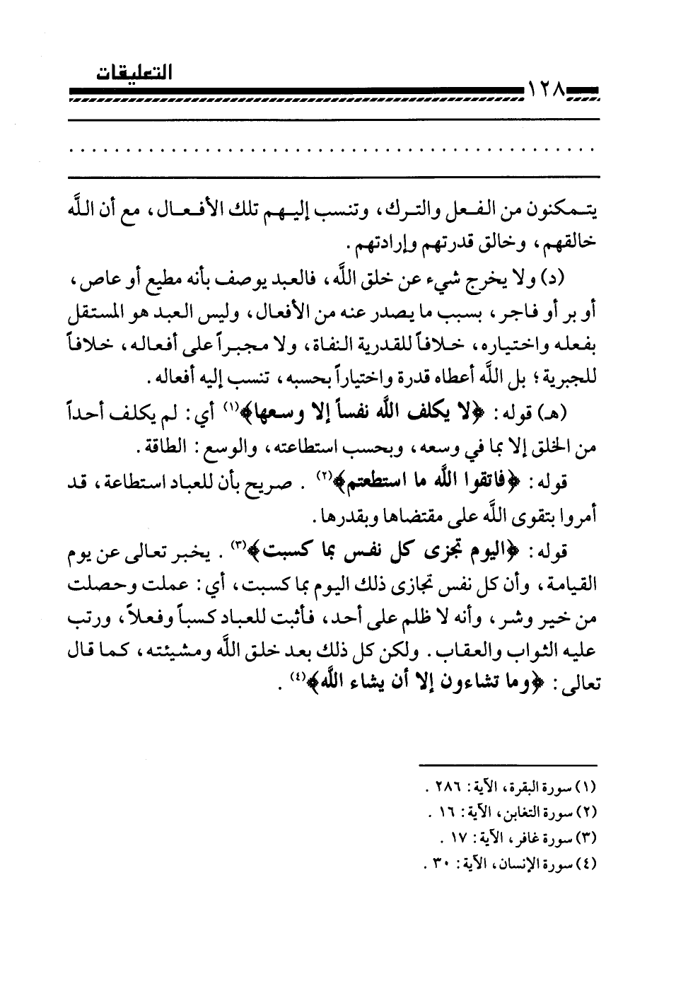 (د) ولا يخرج شيء عن خلق الله، فالعبد يوصف بأنه مطيع أو عاص، أو بر أو فاجر، بسبب ما يصدر عنه من الأفعال، وليس العبد هو المستقل بفعله واختياره، خلافا للقدرية النفاة، ولا مجبرا على أفعاله، خلافا للجبرية، بل الله أعطاه قدرة واختيارا بحسبه، تنسب إليه أفعاله.