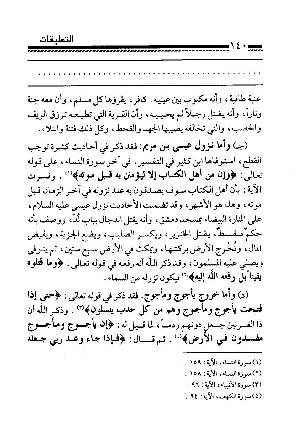 (ج) وأما نزول عيسى بن مريم: فقد ذكر في أحاديث كثيرة توجب القطع، استوفاها ابن كثير في التفسير، في آخر سورة النساء، على قوله تعالى: {وَإِنْ مِنْ أَهْلِ الْكِتَابِ إِلَّا لَيُؤْمِنَنَّ بِهِ قَبْلَ مَوْتِهِ} . وفسرت الآية: بأن أهل الكتاب سوف يصدقون به عند نزوله في آخر الزمان قبل موته، وهذا هو الأشهر، وقد تضمنت الأحاديث نزول عيسى عليه السلام، على المنارة البيضاء بمسجد دمشق وأنه يقتل الدجال بباب لُدٍّ ووصف بأنه حكم مقسط، يقتل الخنزير، ويكسر الصليب، ويضع الجزية، ويفيض المال، وتخرج الأرض بركتها، ويمكث في الأرض سبع سنين، ثم يتوفى ويصلي عليه المسلمون، وقد ذكر الله أنه رفعه في قوله تعالى: {وَمَا قَتَلُوهُ يَقِينًا بَلْ رَفَعَهُ اللَّهُ إِلَيْهِ} فيكون نزوله من السماء.