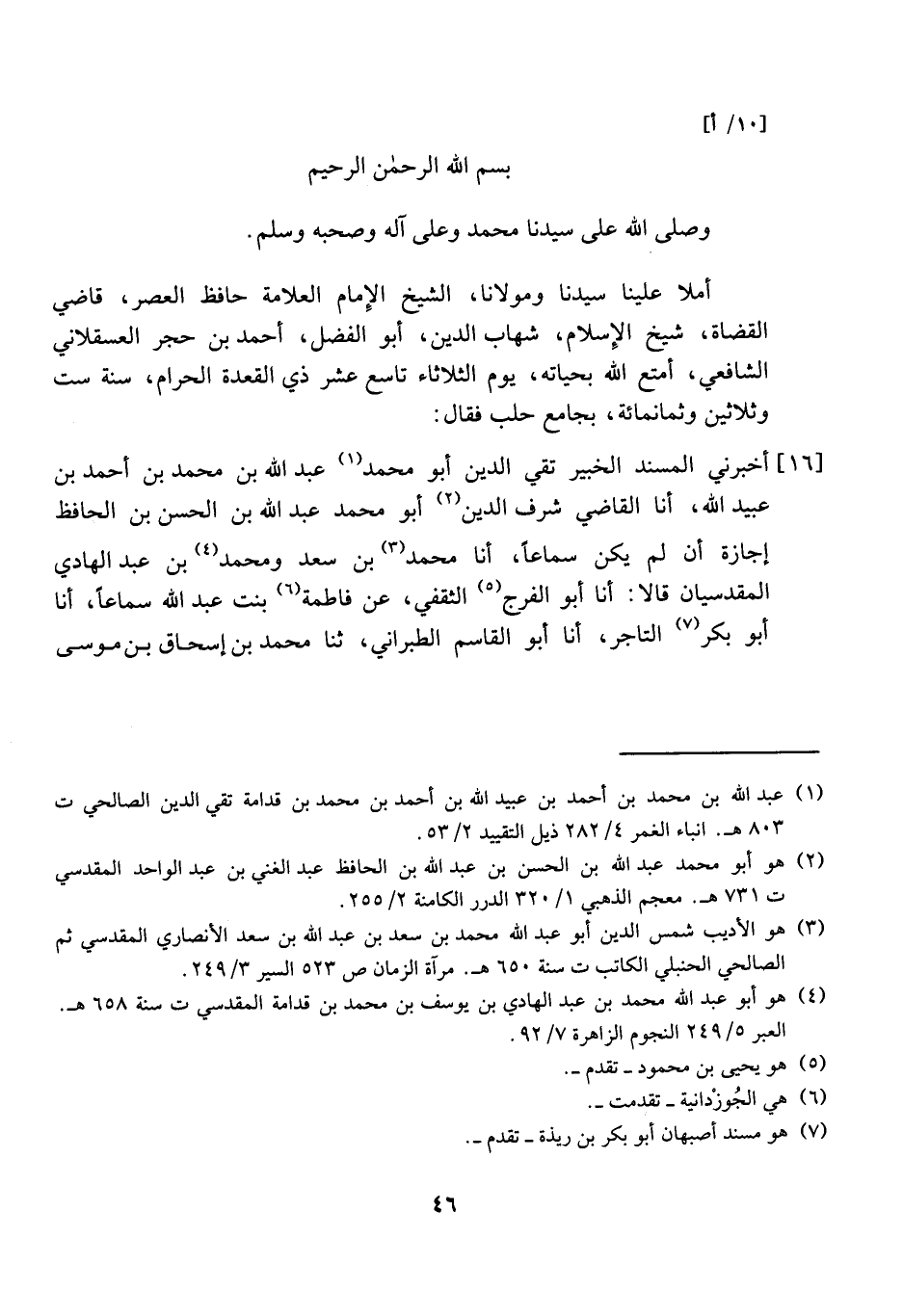 16 - أَخْبرنِي الْمسند الْخَبِير تَقِيّ الدّين أَبُو مُحَمَّد عبد الله بن مُحَمَّد بن أَحْمد بن عبيد الله أَنا القَاضِي شرف الدّين أَبُو مُحَمَّد عبد الله بن الْحسن بن الْحَافِظ إجَازَة أَن لم يكن سَمَاعا أَنا مُحَمَّد بن سعد وَمُحَمّد بن عبد الْهَادِي المقدسيان قَالَا أَنا أَبُو الْفرج الثَّقَفِيّ عَن فَاطِمَة بنت عبد الله سَمَاعا أَنا أَبُو بكر التَّاجِر أَنا أَبُو الْقَاسِم الطَّبَرَانِيّ ثَنَا مُحَمَّد بن إِسْحَاق بن مُوسَى