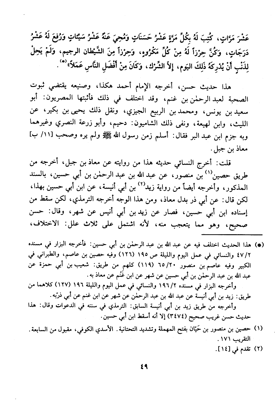 هَذَا حَدِيث حسن أخرجه الإِمَام أَحْمد هَكَذَا وصنيعه يَقْتَضِي ثُبُوت الصُّحْبَة لعبد الرَّحْمَن بن غنم وَقد اخْتلف فِي ذَلِك فأثبتها المصريون أَبُو سعيد بن يُونُس وَمُحَمّد بن الرّبيع الجيزي وَنقل ذَلِك يحيى بن بكير عَن اللَّيْث وَابْن لَهِيعَة وَنفى ذَلِك الشاميون دُحَيْم وَأَبُو زرْعَة النصري وَغَيرهمَا وَبِه جزم ابْن عبد الْبر فَقَالَ أسلم زمن رَسُول الله صلى الله عَلَيْهِ وَسلم وَلم يره وَصَحب 11 ب معَاذ بن جبل