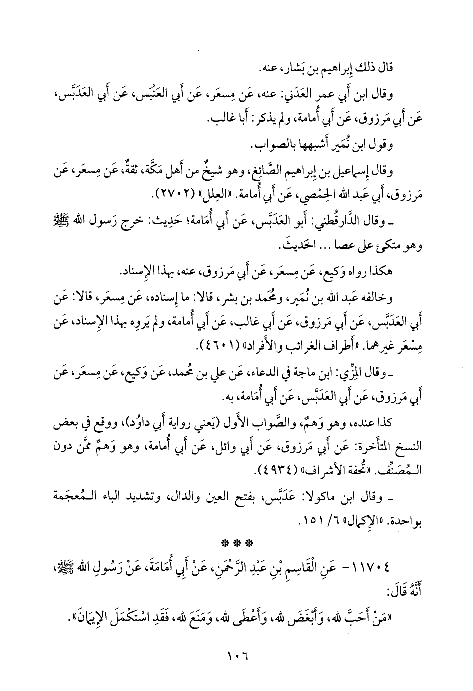 وخالفه عبد الله بن نُمير، ومحمد بن بشر، فأقاما إسناده عن مِسعَر، قالا: عن أبي العَدَبَّس، عن أبي مرزوق، عن أبي غالب، عن أَبي أُمامة، ولم يروه بهذا الإسناد، عن مِسعَر غيرهما. «أطراف الغرائب والأفراد» (٤٦٠١).