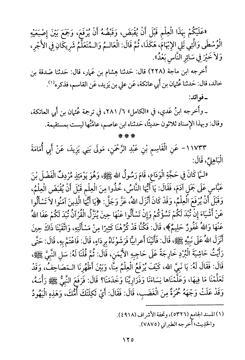 «لما كان في حجة الوداع، قام رسول الله صَلى الله عَليه وسَلم وهو يومئذ مردف الفضل بن عباس على جمل آدم، فقال: يا أيها الناس، خذوا من العلم قبل أن يقبض العلم، وقبل أن يرفع العلم، وقد كان أنزل الله، عز وجل: {يا أيها الذين آمنوا لا تسألوا عن أشياء إن تبد لكم تسؤكم وإن تسألوا عنها حين ينزل القرآن تبد لكم عفا الله عنها والله غفور حليم}، قال: فكنا قد كرهنا كثيرا من مسألته، واتقينا ذاك حين أنزل الله على نبيه صَلى الله عَليه وسَلم قال: فأتينا أعرابيا فرشوناه برداء، قال: فاعتم به، قال: حتى رأيت حاشية البرد خارجة على حاجبه الأيمن، قال: ثم قلنا له: سل النبي صَلى الله عَليه وسَلم قال: فقال له: يا نبي الله، كيف يرفع العلم منا، وبين أظهرنا المصاحف، وقد تعلمنا ما فيها، وعلمناها نساءنا وذرارينا وخدمنا؟ قال: فرفع النبي صَلى الله عَليه وسَلم رأسه، وقد علت وجهه حمرة من الغضب، قال: فقال: أي ثكلتك أمك، وهذه اليهود