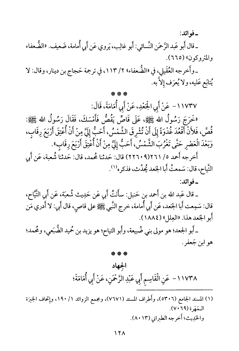 - قلنا: إِسناده ضعيفٌ؛ قال عبد الله بن أحمد بن حنبل: سألت أبي عن حديث شعبة، عن أبي التياح، قال: سمعت أبا الجعد، عن أَبي أُمامة، خرج النبي صَلى الله عَليه وسَلم على قاص، قال أبي: لا أدري من أَبو الجعد هذا. «العلل» (١٨٨٤).