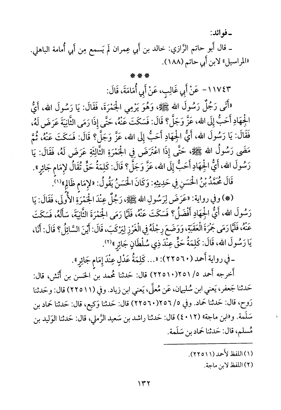«أتى رجل رسول الله صَلى الله عَليه وسَلم وهو يرمي الجمرة، فقال: يا رسول الله، أي الجهاد أحب إلى الله، عز وجل؟ قال: فسكت عنه، حتى إذا رمى الثانية عرض له، فقال: يا رسول الله، أي الجهاد أحب إلى الله، عز وجل؟ قال: فسكت عنه، ثم مضى رسول الله صَلى الله عَليه وسَلم حتى إذا اعترض في الجمرة الثالثة عرض له، فقال: يا رسول الله، أي الجهاد أحب إلى الله، عز وجل؟ قال: كلمة حق تقال لإمام جائر».
