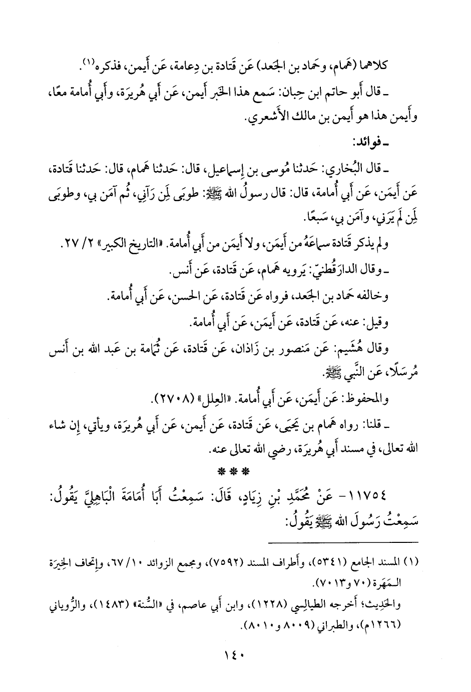 - قال البخاري: حدثنا موسى بن إسماعيل، قال: حدثنا همام، قال: حدثنا قتادة، عن أيمن، عن أَبي أُمامة، قال: قال رسول الله صَلى الله عَليه وسَلم: طوبى لمن رآني، ثم آمن بي، وطوبى لمن لم يرني، وآمن بي، سبعا.