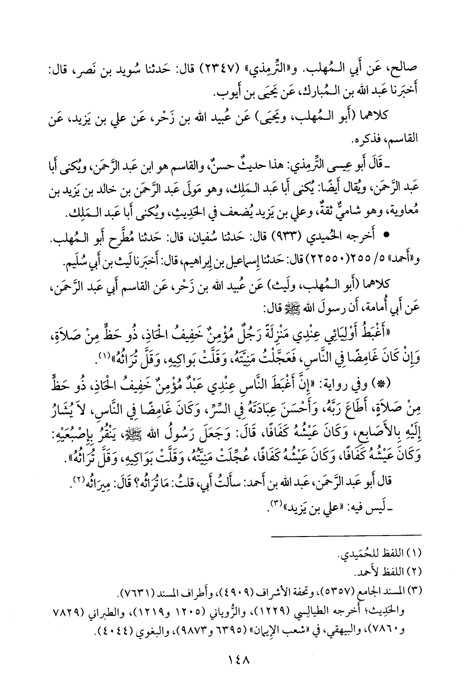 - وفي رواية: «إن أغبط الناس عندي عبد مؤمن خفيف الحاذ، ذو حظ من صلاة، أطاع ربه، وأحسن عبادته في السر، وكان غامضا في الناس، لا يشار إليه بالأصابع، وكان عيشه كفافا، قال: وجعل رسول الله صَلى الله عَليه وسَلم ينقر بإصبعيه: وكان عيشه كفافا، وكان عيشه كفافا، عجلت منيته، وقلت بواكيه، وقل تراثه».