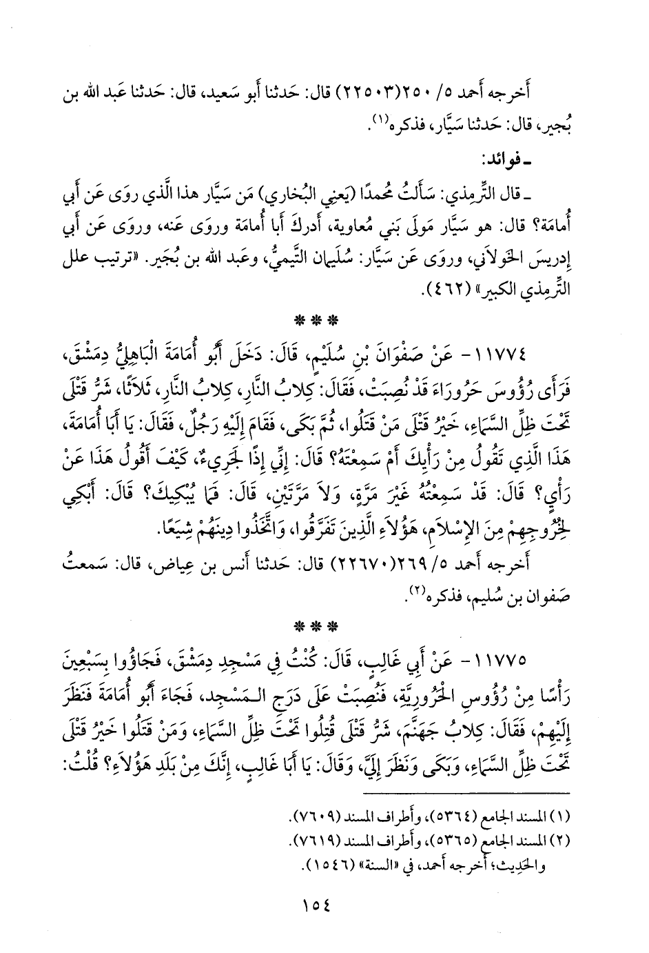 ١١٧٧٤ - عن صفوان بن سليم، قال: دخل أَبو أمامة الباهلي دمشق، فرأى رؤوس حروراء قد نصبت، فقال: كلاب النار، كلاب النار، ثلاثا، شر قتلى تحت ظل السماء، خير قتلى من قتلوا، ثم بكى، فقام إليه رجل، فقال: يا أَبا أُمامة، هذا الذي تقول من رأيك أم سمعته؟ قال: إني إذا لجريء، كيف أقول هذا عن رأي؟ قال: قد سمعته غير مرة، ولا مرتين، قال: فما يبكيك؟ قال: أبكي لخروجهم من الإسلام، هؤلاء الذين تفرقوا، واتخذوا دينهم شيعا.