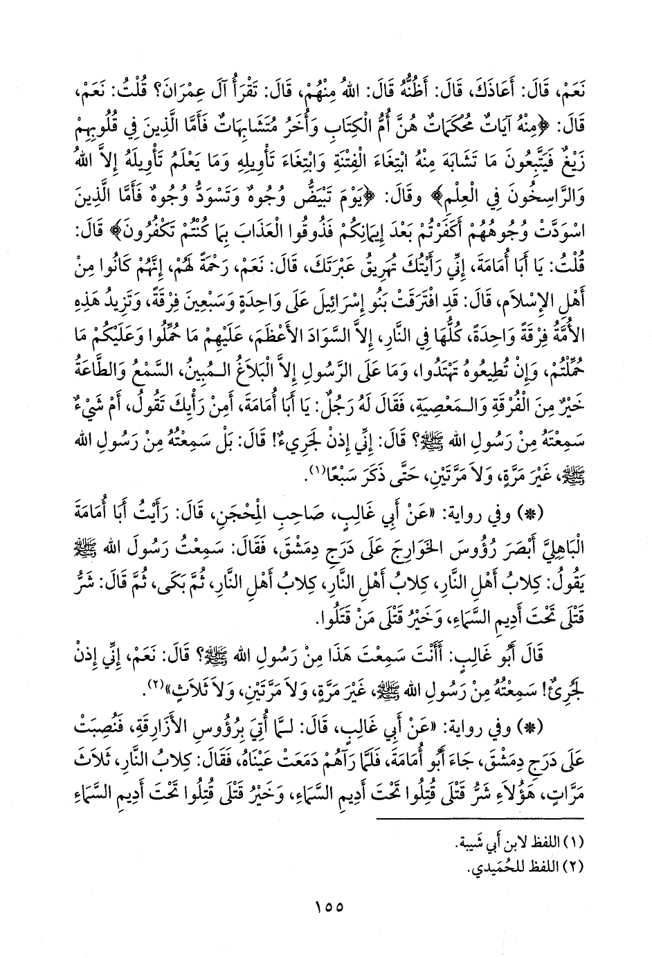 - وفي رواية: «عن أبي غالب, قال: لما أتي برؤوس الأزارقة، فنصبت على درج دمشق، جاء أَبو أمامة، فلما رآهم دمعت عيناه، فقال: كلاب النار، ثلاث مرات، هؤلاء شر قتلى قتلوا تحت أديم السماء، وخير قتلى قتلوا تحت أديم السماء