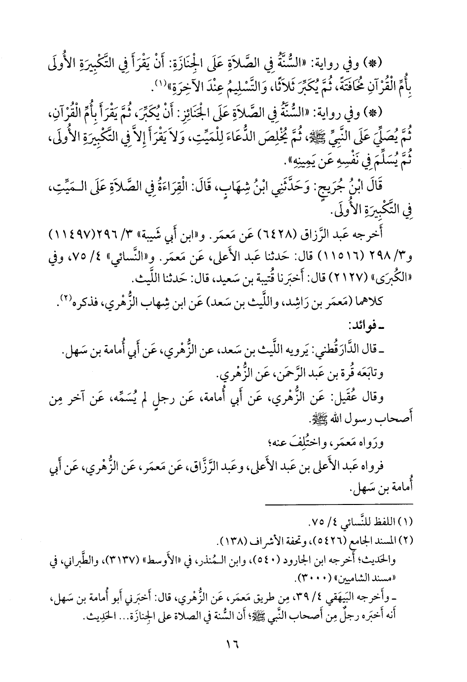 - وأخرجه البيهقي ٤/ ٣٩، من طريق مَعمَر، عن الزُّهْري، قال: أخبرني أَبو أُمامة بن سهل، أنه أخبره رجل من أصحاب النبي صَلى الله عَليه وسَلم؛ أن السنة في الصلاة على الجِنازة، الحديث.