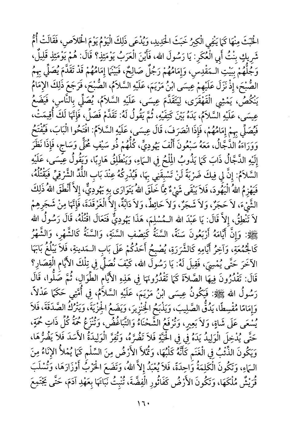 فقالت أم شريك بنت أبي العكر: يا رسول الله، فأين العرب يومئذ؟ قال: هم يومئذ قليل، وجلهم ببيت المقدس، وإمامهم رجل صالح، فبينما إمامهم قد تقدم يصلي بهم الصبح، إذ نزل عليهم عيسى ابن مريم، عليه السلام، الصبح، فرجع ذلك الإمام ينكص، يمشي القهقرى، ليتقدم عيسى، عليه السلام، يصلي بالناس، فيضع عيسى، عليه السلام، يده بين كتفيه، ثم يقول له: تقدم فصل، فإنها لك أقيمت، فيصلي بهم إمامهم، فإذا انصرف، قال عيسى، عليه السلام: افتحوا الباب، فيفتح ووراءه الدجال، معه سبعون ألف يهودي، كلهم ذو سيف محلى وَسَّاج، فإذا نظر إليه الدجال ذاب كما يذوب الملح في الماء، وينطلق هاربا، ويقول عيسى، عليه السلام: إن لي فيك ضربة لن تسبقني بها، فيدركه عند باب اللد الشرقي فيقتله، فيهزم الله اليهود، فلا يبقى شيء مما خلق الله يتوارى به يهودي، إلا أنطق الله ذلك الشيء، لا حجر، ولا شجر، ولا حائط، ولا دابة، إلا الغرقدة، فإنها من شجرهم لا تنطق، إلا قال: يا عبد الله المسلم، هذا يهودي فتعال اقتله, قال رسول الله صَلى الله عَليه وسَلم: وإن أيامه أربعون سنة، السنة كنصف السنة، والسنة كالشهر، والشهر كالجمعة، وآخر أيامه كالشررة، يصبح أحدكم على باب المدينة، فلا يبلغ بابها الآخر حتى يمسي، فقيل له: يا رسول الله، كيف نصلي في تلك الأيام القصار؟ قال: تقدرون فيها الصلاة كما تقدرونها في هذه الأيام الطوال، ثم صلوا، قال رسول الله صَلى الله عَليه وسَلم: فيكون عيسى ابن مريم، عليه السلام، في أمتي حكما عدلا، وإماما مقسطا، يدق الصليب، ويذبح الخنزير، ويضع الجزية، ويترك الصدقة، فلا يسعى على شاة، ولا بعير، وترفع الشحناء والتباغض، وتنزع حمة كل ذات حمة، حتى يدخل الوليد يده في في الحية فلا تضره، وتفر الوليدة الأسد فلا يضرها، ويكون الذئب في الغنم كأنه كلبها، وتملأ الأرض من السلم كما يملأ الإناء من الماء، وتكون الكلمة واحدة، فلا يعبد إلا الله، وتضع الحرب أوزارها، وتسلب قريش ملكها، وتكون الأرض كفاثور الفضة، تنبت نباتها بعهد آدم، حتى يجتمع