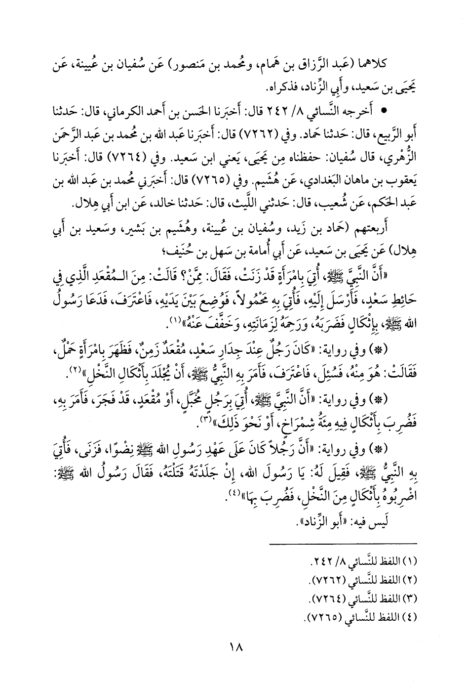 • وأخرجه النَّسَائي في «الكبرى» (٧٢٦١) قال: أخبرنا سويد بن نصر بن سويد، قال: أخبرنا عبد الله، هو ابن المبارك، عن ابن عُيينة، قال: أخبرنا أَبو الزناد، عن أَبي أُمامة بن سهل؛