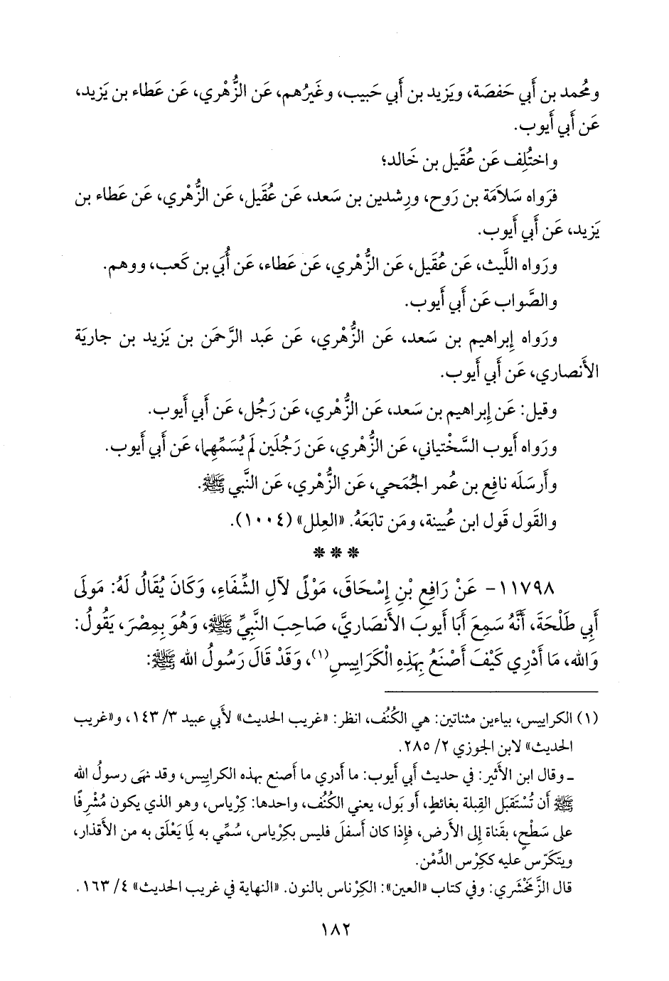 ١١٧٩٨ - عن رافع بن إسحاق مَولًى لآل الشفاء، وكان يقال له: مولى أبي طلحة، أنه سمع أبا أيوب الأَنصاري، صاحب النبي صَلى الله عَليه وسَلم وهو بمصر، يقول: والله، ما أدري كيف أصنع بهذه الكراييس (¬١)، وقد قال رسول الله صَلى الله عَليه وسَلم: