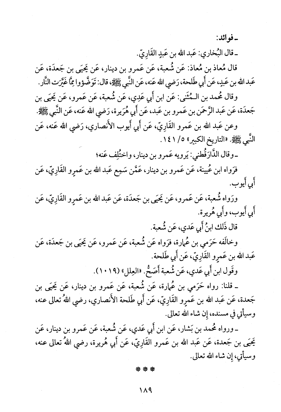 - قلنا: رواه محمد بن بشار، عن ابن أَبي عَدي، عن شعبة، عن عَمرو بن دينار، عن يحيى بن جَعدة، عن عبد الله بن عَمرو القَاري، عن أَبي هريرة، رضي الله تعالى عنه، ويأتي في مسنده برقم (١٣٨٠٨).