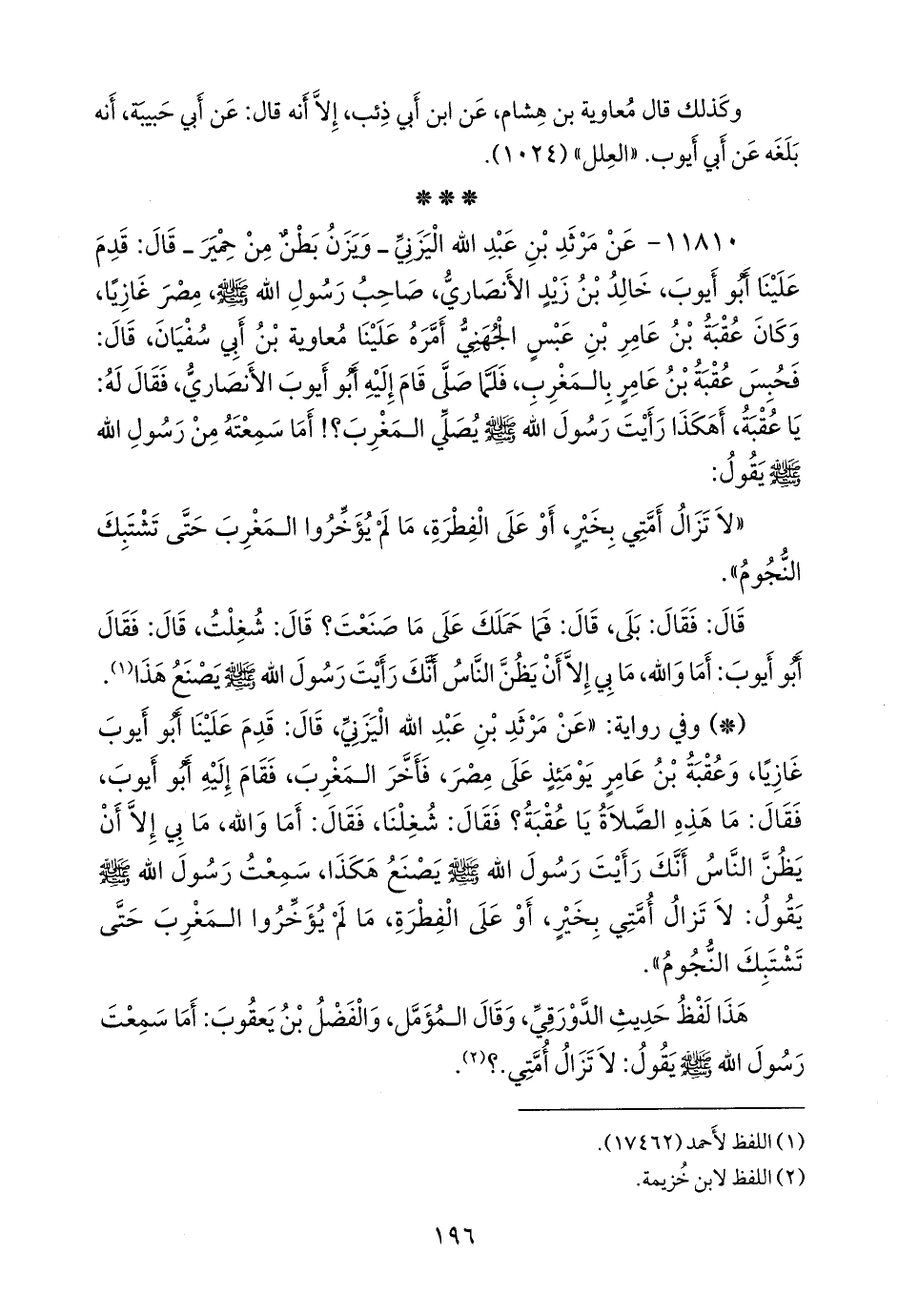 - وفي رواية: «عن مَرثد بن عبد الله اليزني، قال: قدم علينا أَبو أيوب غازيا، وعقبة بن عامر يومئذ على مصر، فأخر المغرب، فقام إليه أَبو أيوب، فقال: ما هذه الصلاة يا عقبة؟ فقال: شغلنا، فقال: أما والله، ما بي إلا أن يظن الناس أنك رأيت رسول الله صَلى الله عَليه وسَلم يصنع هكذا، سمعت رسول الله صَلى الله عَليه وسَلم يقول: لا تزال أمتي بخير، أو على الفطرة، ما لم يؤخروا المغرب حتى تشتبك النجوم».