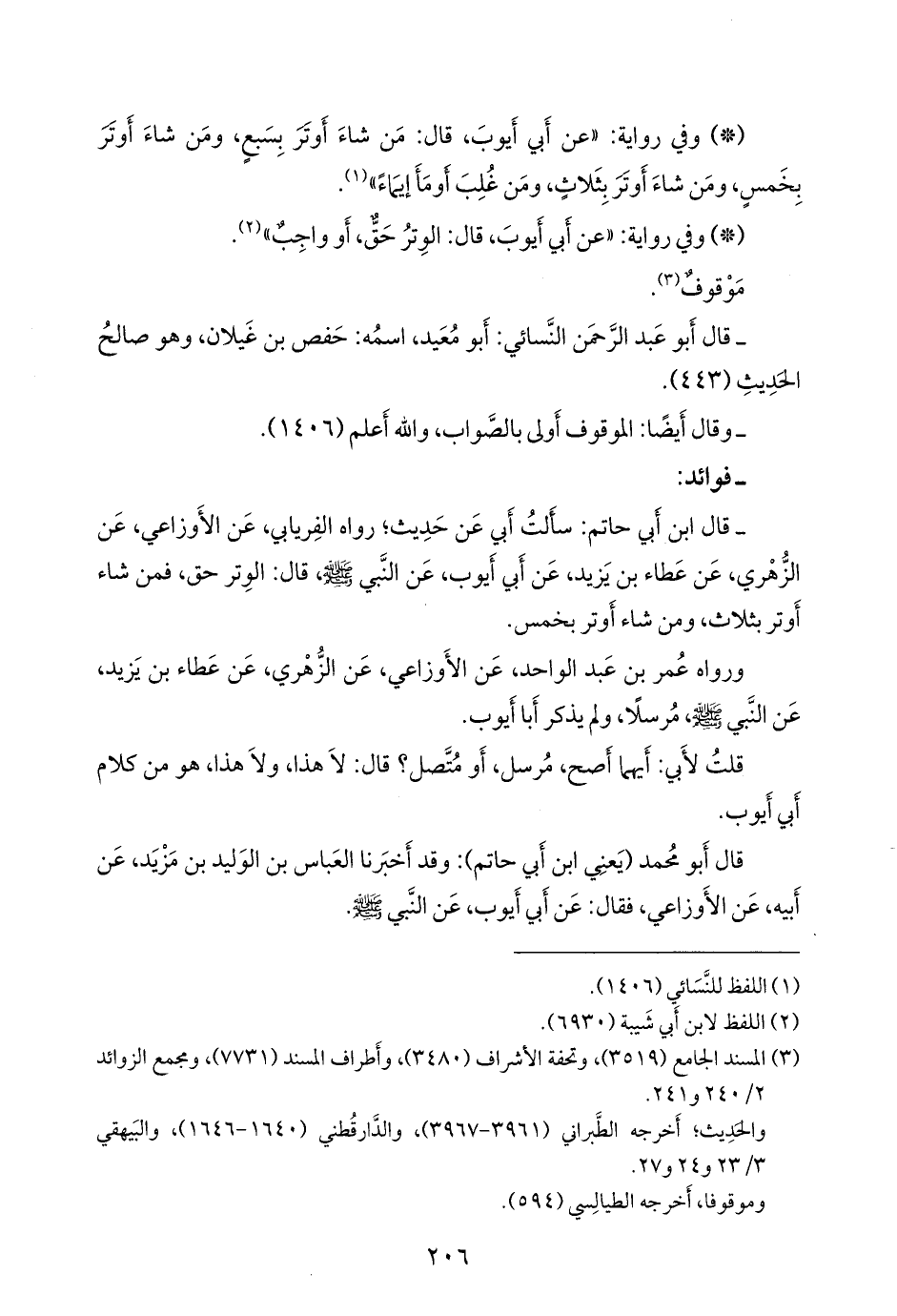 - قال عبد الرَّحمَن بن أبي حاتم الرازي: سألتُ أبي عن حديثٍ؛ رواه الفريابي، عن الأوزاعي، عن الزُّهْري، عن عطاء بن يزيد، عن أَبي أَيوب، عن النبي صَلى الله عَليه وسَلم قال: الوتر حق، فمن شاء أوتر بثلاث، ومن شاء أوتر بخمس.