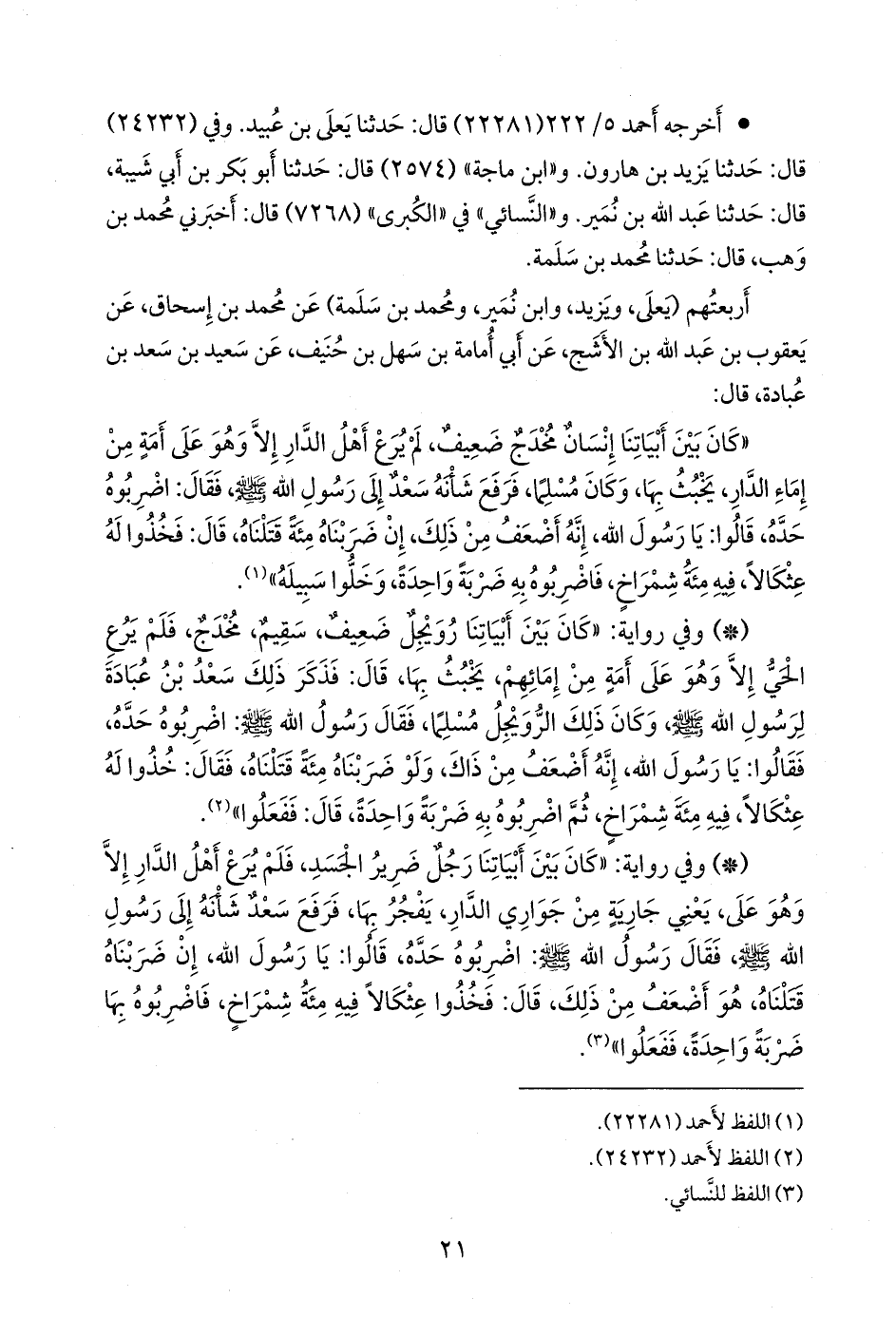 - وفي رواية: «كان بين أبياتنا رويجل ضعيف، سقيم، مخدج، فلم يرع الحي إلا وهو على أمة من إمائهم، يخبث بها، قال: فذكر ذلك سعد بن عبادة لرسول الله صَلى الله عَليه وسَلم وكان ذلك الرويجل مسلما، فقال رسول الله صَلى الله عَليه وسَلم: اضربوه حده، فقالوا: يا رسول الله، إنه أضعف من ذاك، ولو ضربناه مئة قتلناه، فقال: خذوا له عثكالا، فيه مئة شمراخ، ثم اضربوه به ضربة واحدة، قال: ففعلوا» (¬٢).