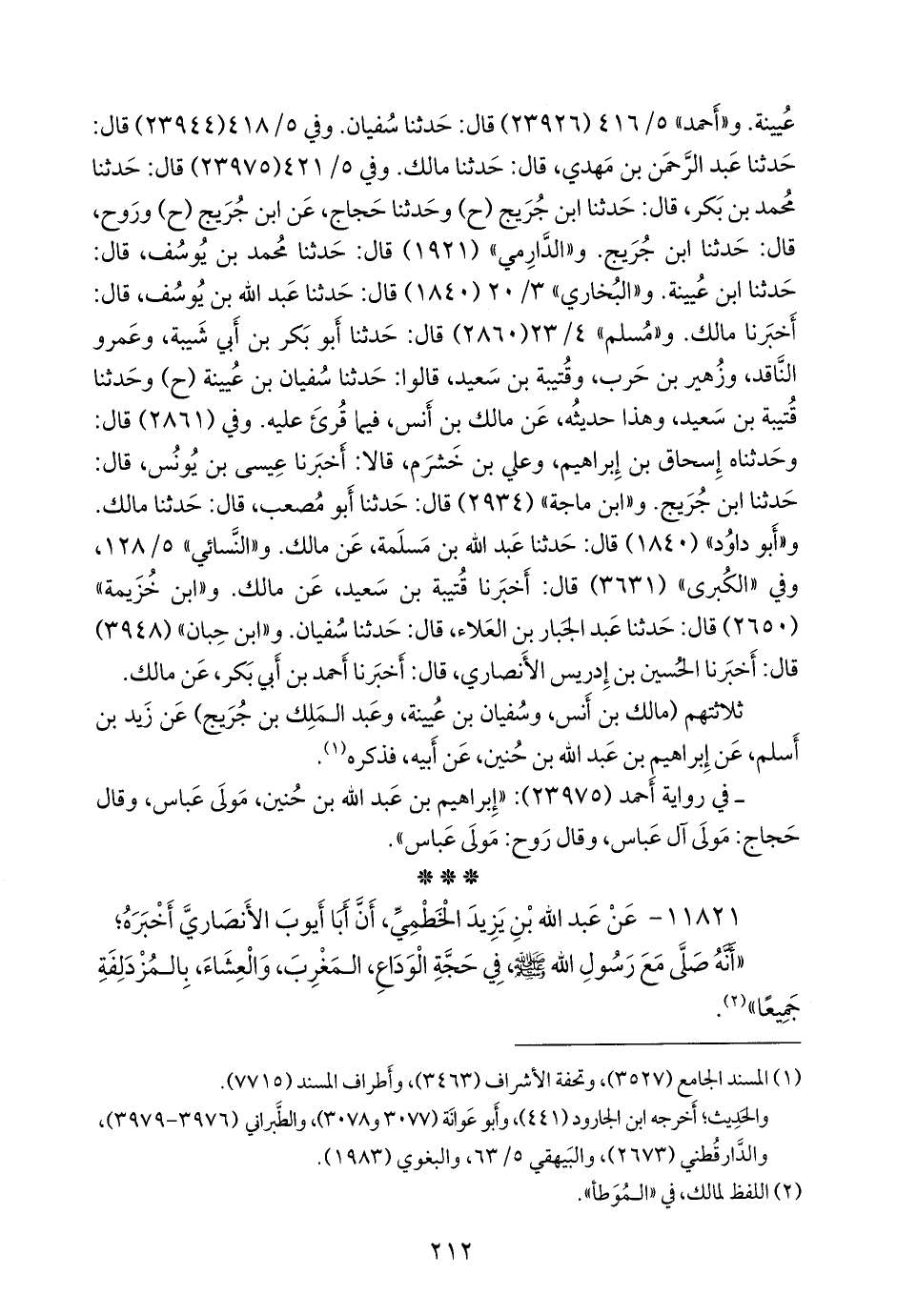 - لم نورد هنا رواية يحيى بن يحيى للموطأ، وذكرناه عن هذه الروايات، لوروده في رواية يحيى بن يحيى (٩٠١)، عن زيد بن أسلم، عن نافع، عن إبراهيم بن عبد الله بن حنين، عن أبيه؛ أن عبد الله بن عباس، والمسور بن مخرمة، اختلفا بالأَبواء، الحديث، زاد فيه: «عن نافع».
