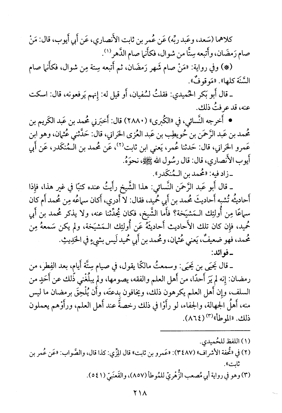 كلاهما (سعد، وعبد رَبِّه) عن عمر بن ثابت الأَنصاري، عن أَبي أَيوب، قال: من صام رمضان، وأتبعه ستا من شوال، فكأنما صام الدهر (¬١).