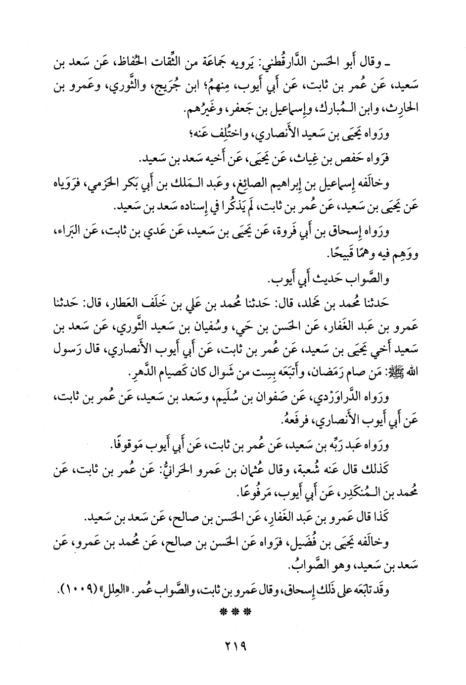 - قال أَبو الحسن الدارقُطني: يرويه جماعة من الثقات الحفاظ، عن سعد بن سعيد، عن عمر بن ثابت، عن أَبي أَيوب، منهم؛ ابن جُريج، والثوري، وعَمرو بن الحارث، وابن المبارك، وإسماعيل بن جعفر، وغيرهم.