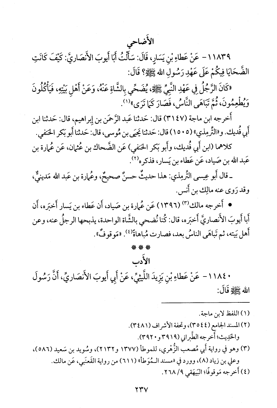 • أخرجه مالك (¬٣) (١٣٩٦) عن عمارة بن صياد، أن عطاء بن يسار أخبره، أن أبا أيوب الأَنصاري أخبره، قال: كنا نضحي بالشاة الواحدة، يذبحها الرجل عنه، وعن أهل بيته، ثم تباهى الناس بعد، فصارت مباهاة (¬٤). «موقوف».
