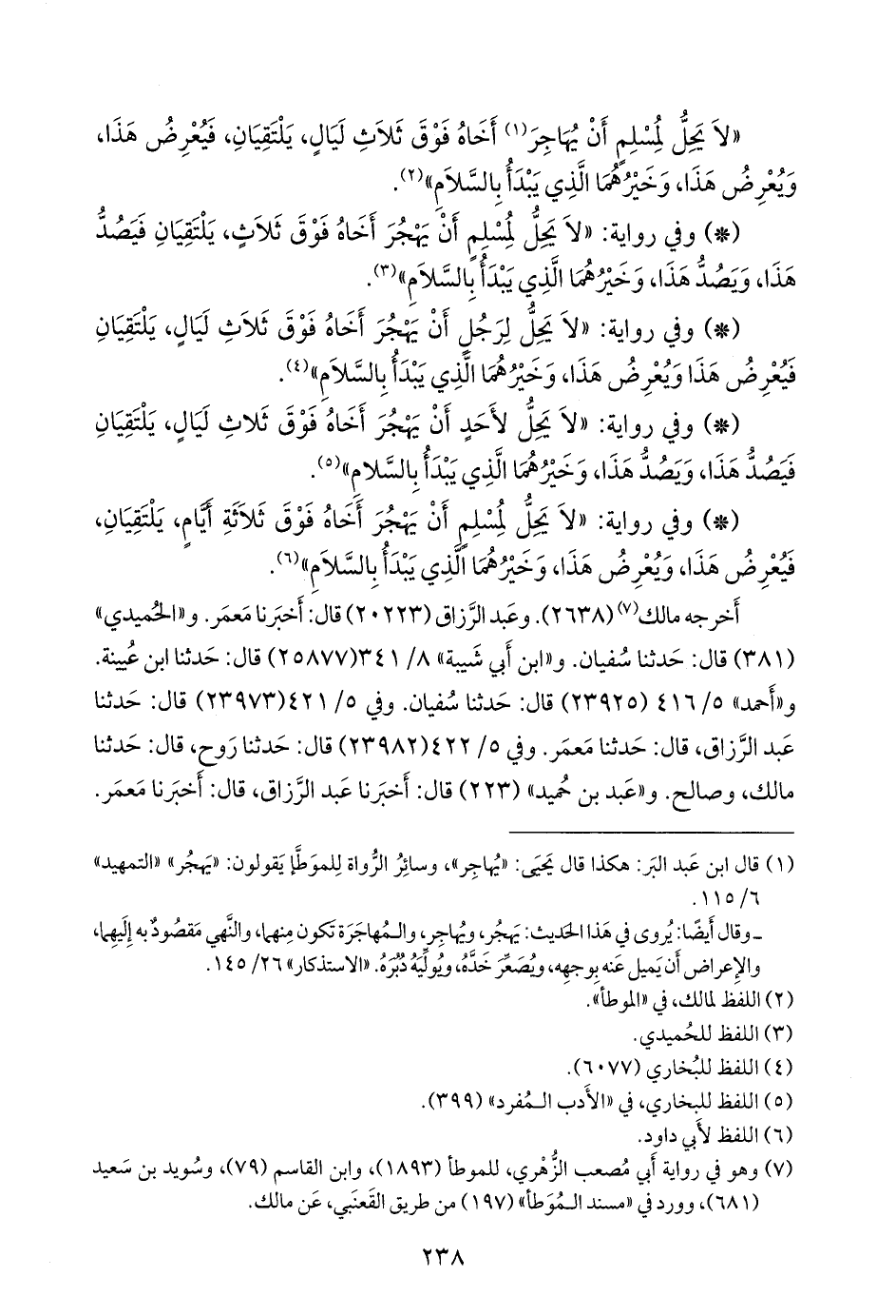 - وفي رواية: «لا يحل لمسلم أن يهجر أخاه فوق ثلاثة أيام، يلتقيان، فيعرض هذا، ويعرض هذا، وخيرهما الذي يبدأ بالسلام» (¬١).