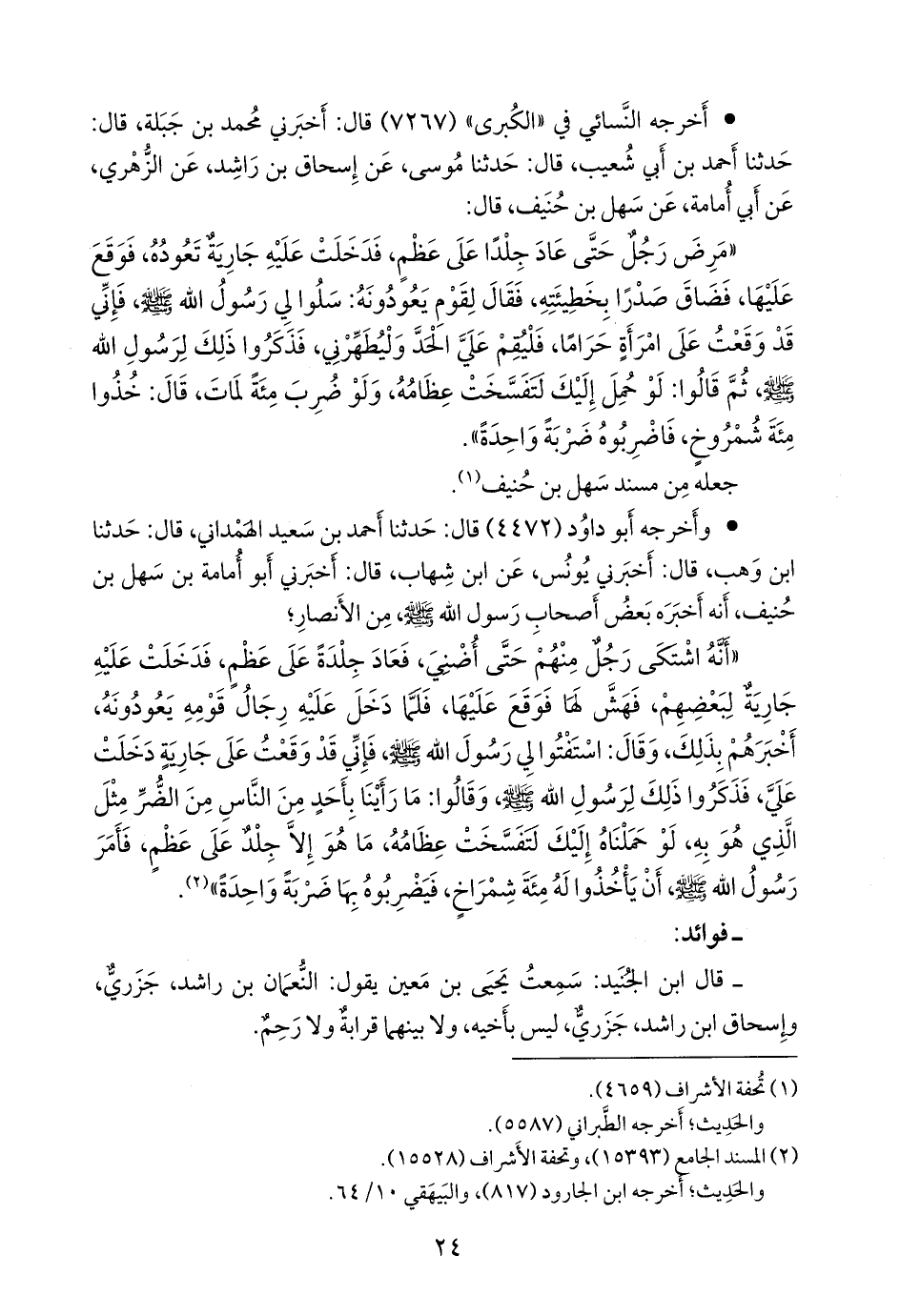 «أنه اشتكى رجل منهم حتى أضني، فعاد جلدة على عظم، فدخلت عليه جارية لبعضهم، فهش لها فوقع عليها، فلما دخل عليه رجال قومه يعودونه، أخبرهم بذلك، وقال: استفتوا لي رسول الله صَلى الله عَليه وسَلم فإني قد وقعت على جارية دخلت علي، فذكروا ذلك لرسول الله صَلى الله عَليه وسَلم وقالوا: ما رأينا بأحد من الناس من الضر مثل الذي هو به، لو حملناه إليك لتفسخت عظامه، ما هو إلا جلد على عظم، فأمر رسول الله صَلى الله عَليه وسَلم أن يأخذوا له مئة شمراخ، فيضربوه بها ضربة واحدة» (¬٢).