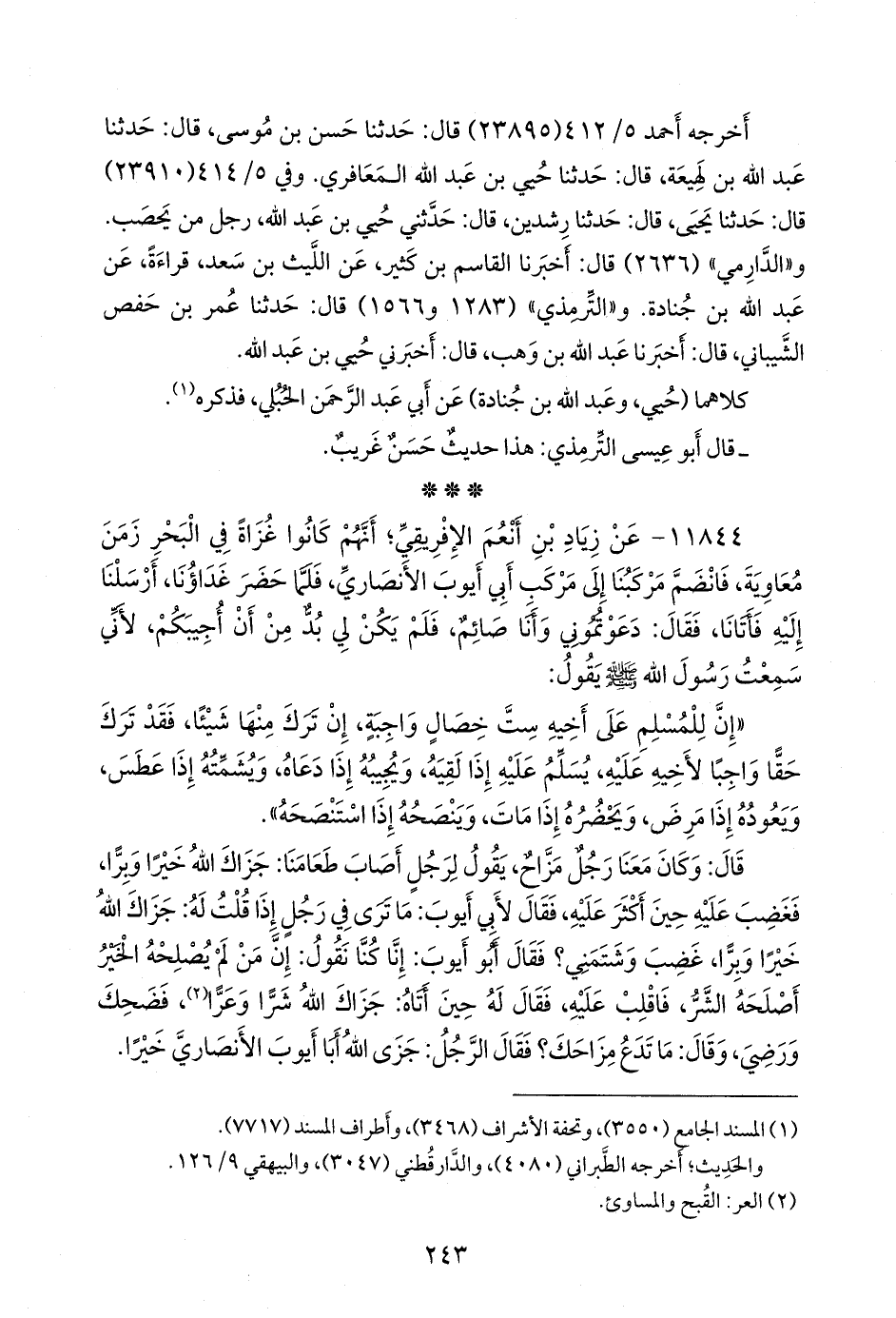 ١١٨٤٤ - عن زياد بن أَنْعُم الإفريقي؛ أنهم كانوا غزاة في البحر زمن معاوية، فانضم مركبنا إلى مركب أَبي أَيوب الأَنصاري، فلما حضر غداؤنا، أرسلنا إليه فأتانا، فقال: دعوتموني وأنا صائم، فلم يكن لي بد من أن أجيبكم، لأني سمعت رسول الله صَلى الله عَليه وسَلم يقول: