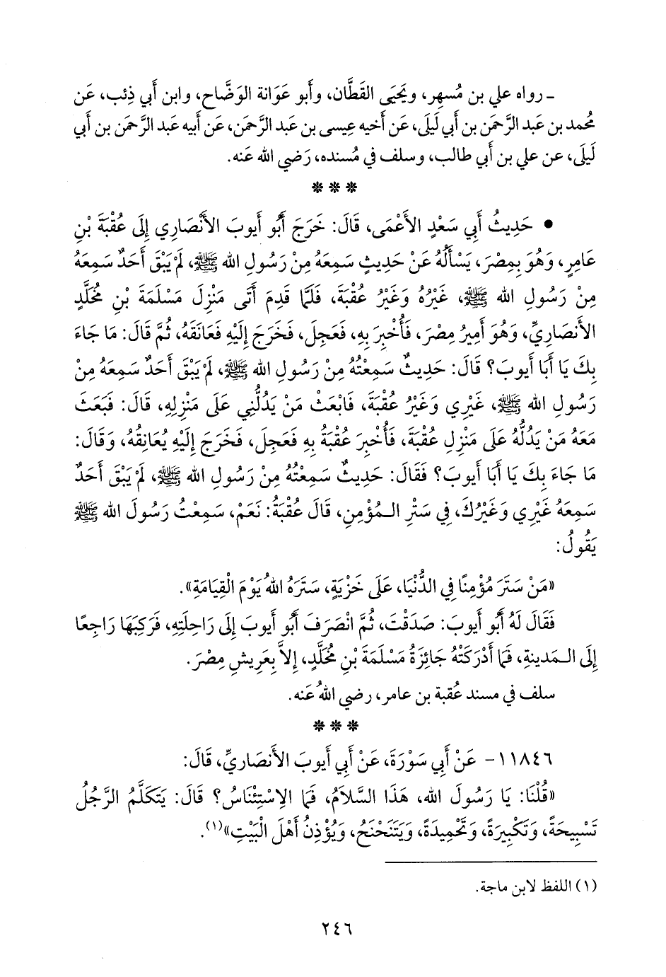 • حديث أبي سعد الأعمى، قال: خرج أَبو أيوب الأَنصاري إلى عقبة بن عامر، وهو بمصر، يسأله عن حديث سمعه من رسول الله صَلى الله عَليه وسَلم لم يبق أحد سمعه من رسول الله صَلى الله عَليه وسَلم غيره وغير عقبة، فلما قدم أتى منزل مَسلَمة بن مُخَلَّد الأَنصاري، وهو أمير مصر، فأخبر به، فعجل، فخرج إليه فعانقه، ثم قال: ما جاء بك يا أبا أيوب؟ قال: حديث سمعته من رسول الله صَلى الله عَليه وسَلم لم يبق أحد سمعه من رسول الله صَلى الله عَليه وسَلم غيري وغير عقبة، فابعث من يدلني على منزله، قال: فبعث معه من يدله على منزل عقبة، فأخبر عقبة به فعجل، فخرج إليه يعانقه، وقال: ما جاء بك يا أبا أيوب؟ فقال: حديث سمعته من رسول الله صَلى الله عَليه وسَلم لم يبق أحد سمعه غيري وغيرك، في ستر المؤمن، قال عقبة: نعم، سمعت رسول الله صَلى الله عَليه وسَلم يقول: