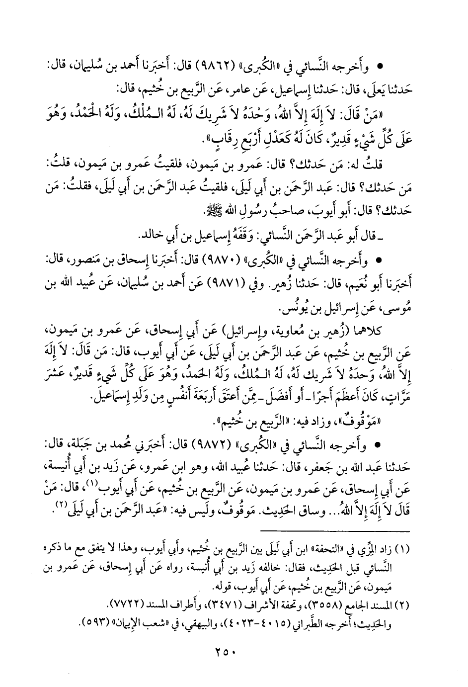 • وأخرجه النَّسَائي في «الكبرى» (٩٨٧٢) قال: أخبرني محمد بن جبلة، قال: حدثنا عبد الله بن جعفر، قال: حدثنا عُبيد الله، وهو ابن عَمرو، عن زيد بن أَبي أُنيسة، عن أبي إسحاق، عن عَمرو بن ميمون، عن الربيع بن خثيم، عن أَبي أَيوب (¬١)، قال: من قال لا إله إلا الله ... وساق الحديث. موقوف، وليس فيه: «عبد الرَّحمَن بن أبي ليلى» (¬٢).