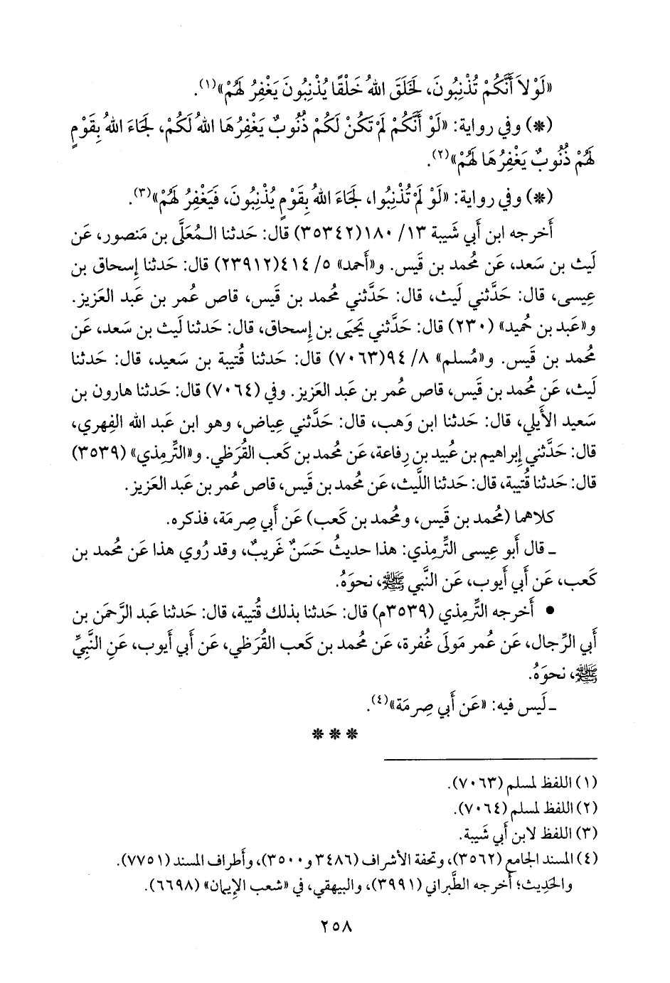 • أخرجه التِّرمِذي (٣٥٣٩ م) قال: حدثنا بذلك قتيبة, قال: حدثنا عبد الرَّحمَن بن أبي الرجال، عن عمر مولى غفرة، عن محمد بن كعب القرظي، عن أَبي أَيوب، عن النبي صَلى الله عَليه وسَلم نحوه.