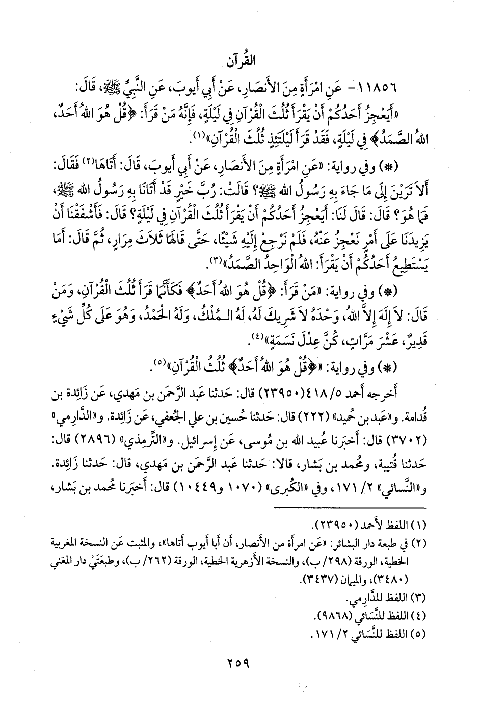 - وفي رواية: «{قُلْ هُوَ اللهُ أَحَدٌ} ثلث القرآن» (¬٥).