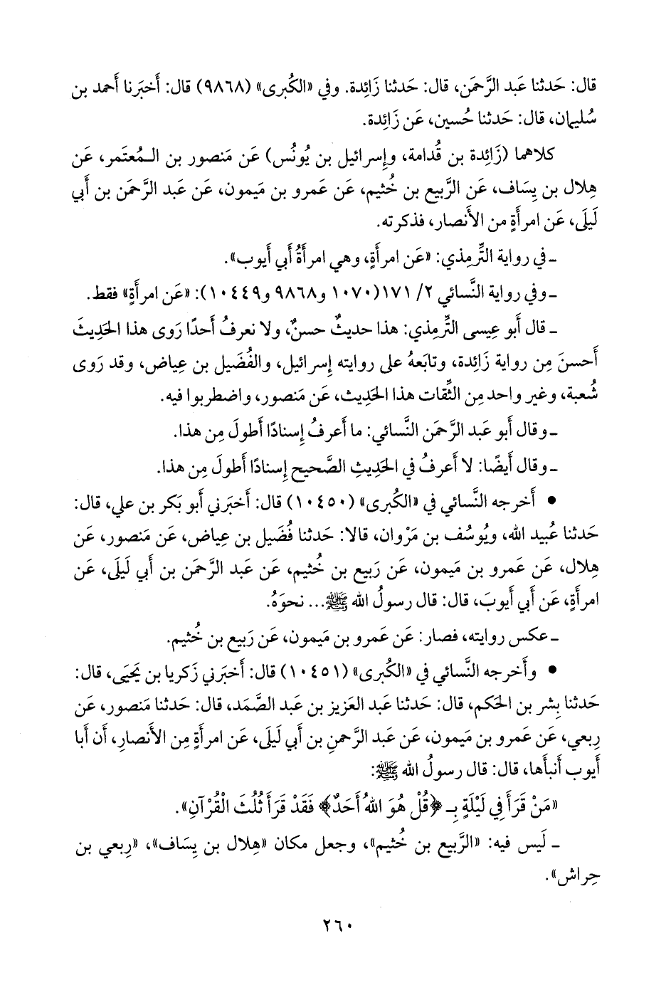 • وأخرجه النَّسَائي في «الكبرى» (١٠٤٥١) قال: أخبرني زكريا بن يحيى، قال: حدثنا بشر بن الحكم، قال: حدثنا عبد العزيز بن عبد الصمد، قال: حدثنا منصور، عن رِبعي، عن عَمرو بن ميمون، عن عبد الرَّحمَن بن أبي ليلى، عن امرأة من الأنصار، أن أبا أيوب أنبأها، قال: قال رسول الله صَلى الله عَليه وسَلم: