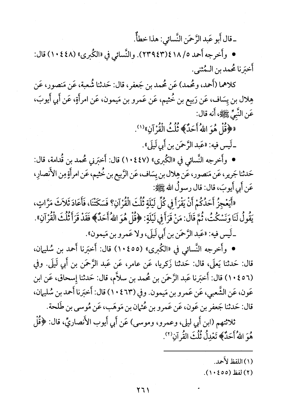 ثلاثتهم (ابن أبي ليلى، وعَمرو، وموسى) عن أَبي أَيوب الأَنصاري، قال: {قُلْ هُوَ اللهُ أَحَدٌ} تعدل ثلث القرآن (¬١).