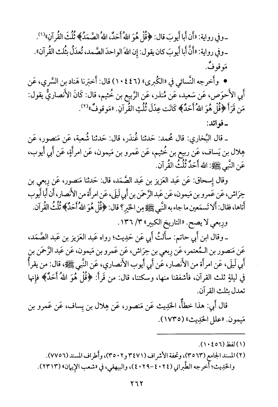 - وقال ابن أبي حاتم: سألتُ أبي عن حديثٍ؛ رواه عبد العزيز بن عبد الصمد، عن منصور بن المُعتَمِر، عن رِبعي بن حِراش، عن عَمرو بن ميمون، عن عبد الرَّحمَن بن أبي ليلى، عن امرأة من الأنصار، عن أَبي أَيوب الأَنصاري، عن النبي صَلى الله عَليه وسَلم قال: من يقرأ في ليلة ثلث القرآن، فأشفقنا منها، وسكتنا، قال: من قرأ: {قُلْ هُوَ اللهُ أَحَدٌ} فإنها تعدل بثلث القرآن.