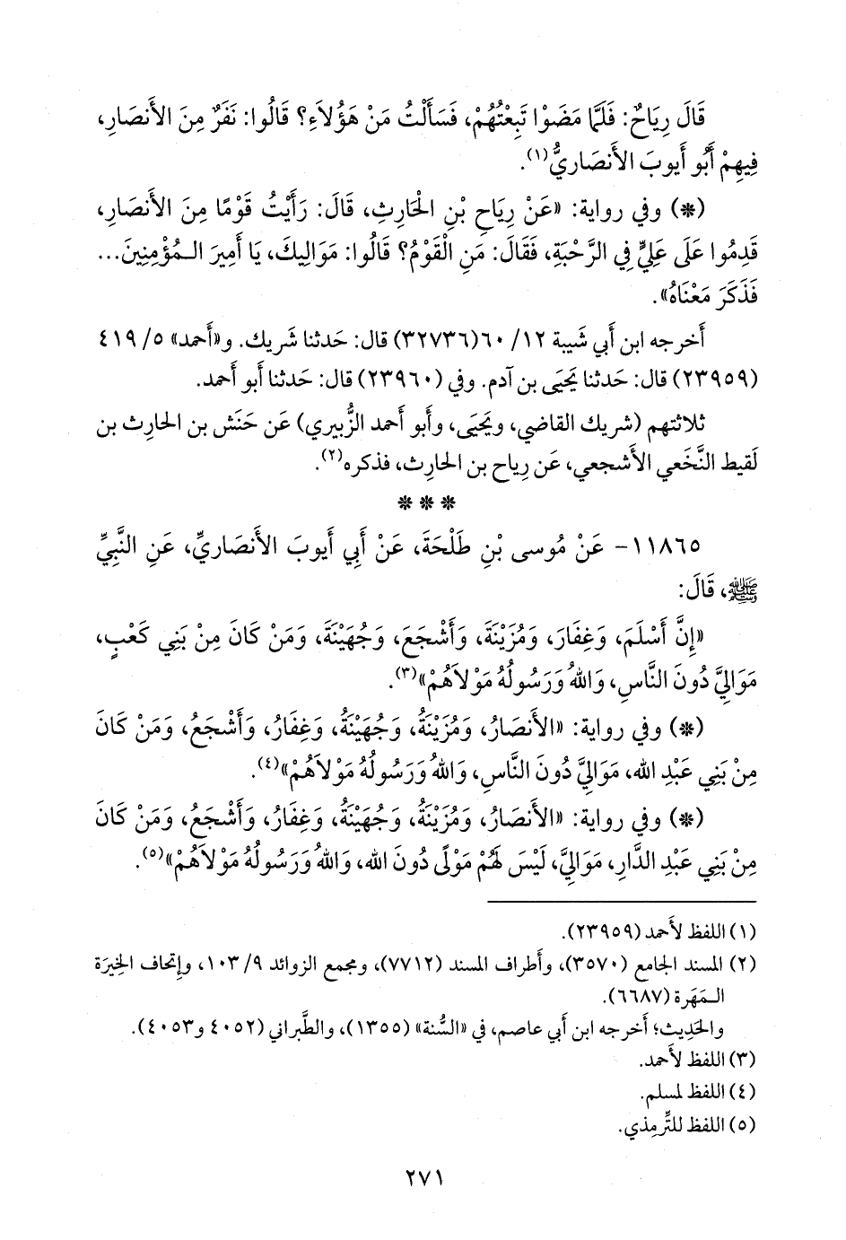 - وفي رواية: «عن رياح بن الحارث، قال: رأيت قوما من الأنصار، قدموا على علي في الرحبة، فقال: من القوم؟ قالوا: مواليك، يا أمير المؤمنين، فذكر معناه».