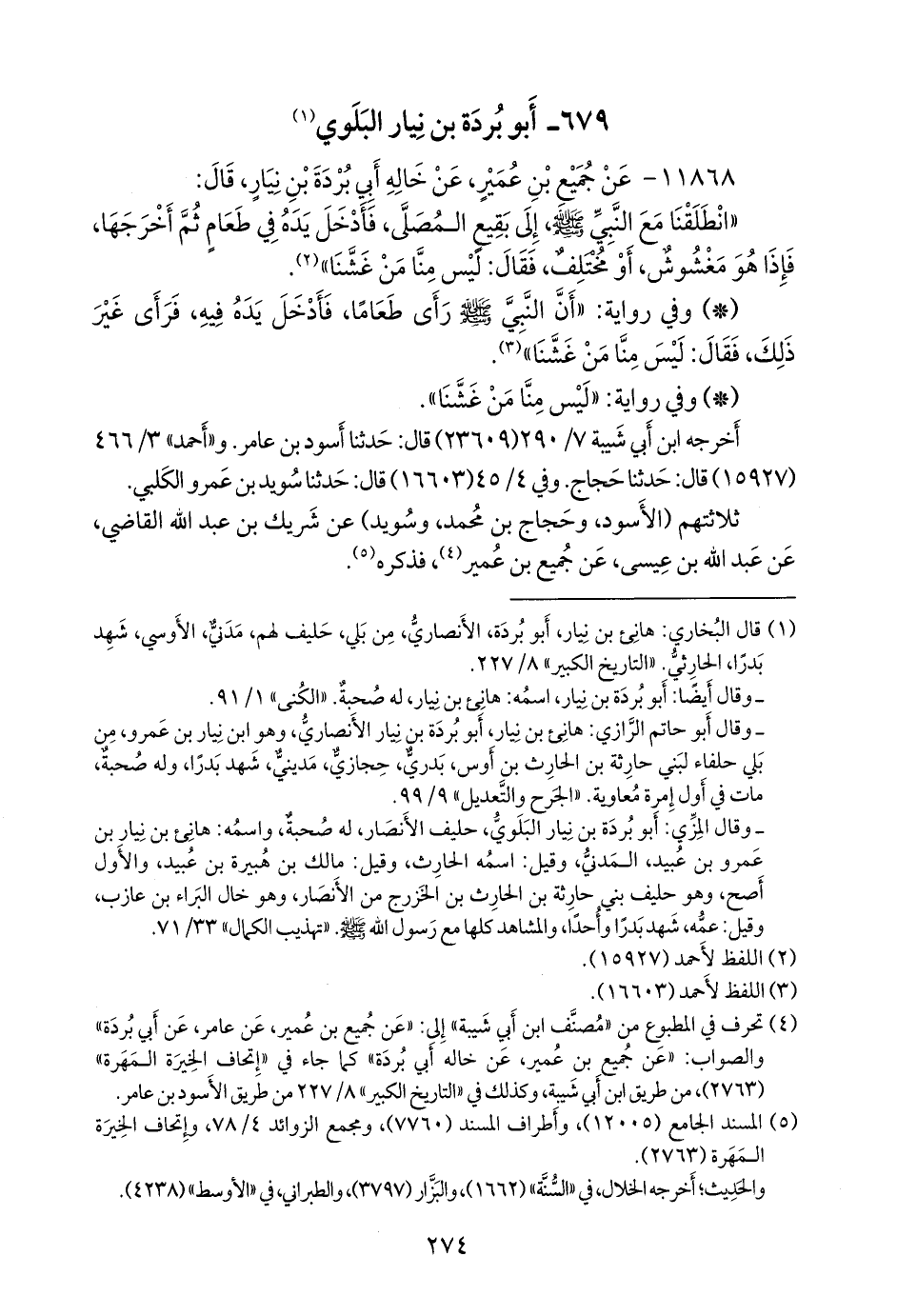 (¬٤) تحرف في طبعات دار الرشد والقِبلة والفاروق لـ «مصنف ابن أبي شيبة» إلى: «عن جميع بن عمير، عن عامر، عن أبي بردة» وصوابه: «عن جميع بن عمير، عن خاله أبي بردة»، كما جاء في «إتحاف الخيرَة المَهَرة» (٢٧٦٣)، من طريق ابن أبي شيبة، وكذلك في «التاريخ الكبير» ٨/ ٢٢٧ من طريق الأسود بن عامر، وقال الزيلعي: وأما حديث أبي بُردة؛ فرواه ابن أبي شيبة، في «مسنده»: حدثنا أسود بن عامر، حدثنا شريك، عن عبد الله بن عيسى، عن جُميع بن عمير، عن خاله أبي بردة بن نيار. «تخريج أحاديث الكشاف» ٢/ ٢٠١، وأثبتها محقق طبعة إشبيليا، مخالفًا ما اعتمده من مخطوطات: «عن جميع بن عمير، عن عمه أبي بردة».
