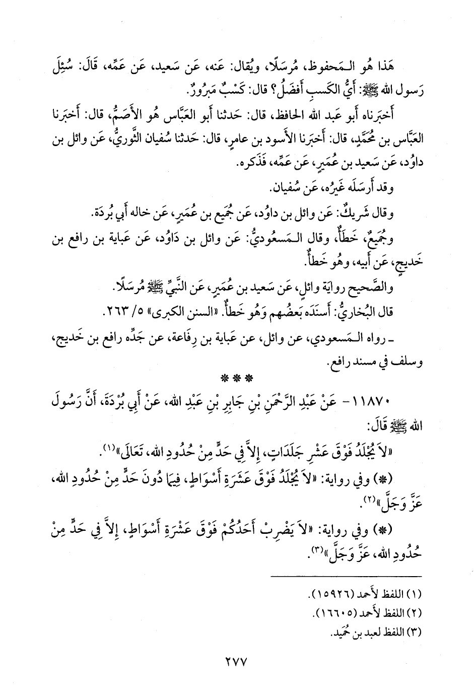 - وفي رواية: «لا يضرب أحدكم فوق عشرة أسواط، إلا في حد من حدود الله، عز وجل» (¬٣).