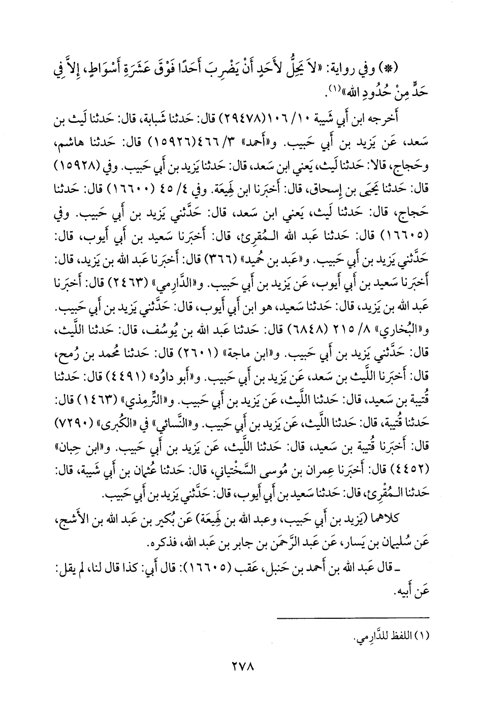 و «الدَّارِمي» (٢٤٦٣) قال: أخبرنا عبد الله بن يزيد, قال: حدثنا سعيد، هو ابن أَبي أَيوب، قال: حدثني يزيد بن أبي حبيب. و «البخاري» ٨/ ٢١٥ (٦٨٤٨) قال: حدثنا عبد الله بن يوسف, قال: حدثنا الليث، قال: حدثني يزيد بن أبي حبيب. و «ابن ماجة» (٢٦٠١) قال: حدثنا محمد بن رُمح, قال: أخبرنا الليث بن سعد، عن يزيد بن أبي حبيب. و «أَبو داود» (٤٤٩١) قال: حدثنا قتيبة بن سعيد, قال: حدثنا الليث، عن يزيد بن أبي حبيب. و «التِّرمِذي» (١٤٦٣) قال: حدثنا قتيبة, قال: حدثنا الليث، عن يزيد بن أبي حبيب. و «النَّسَائي» في «الكبرى» (٧٢٩٠) قال: أخبرنا قتيبة بن سعيد، قال: حدثنا الليث، عن يزيد بن أبي حبيب. و «ابن حِبَّان» (٤٤٥٢) قال: أخبرنا عمران بن موسى السَّخْتِياني، قال: حدثنا عثمان بن أبي شيبة، قال: حدثنا المُقرِئ، قال: حدثنا سعيد بن أَبي أَيوب، قال: حدثني يزيد بن أبي حبيب.