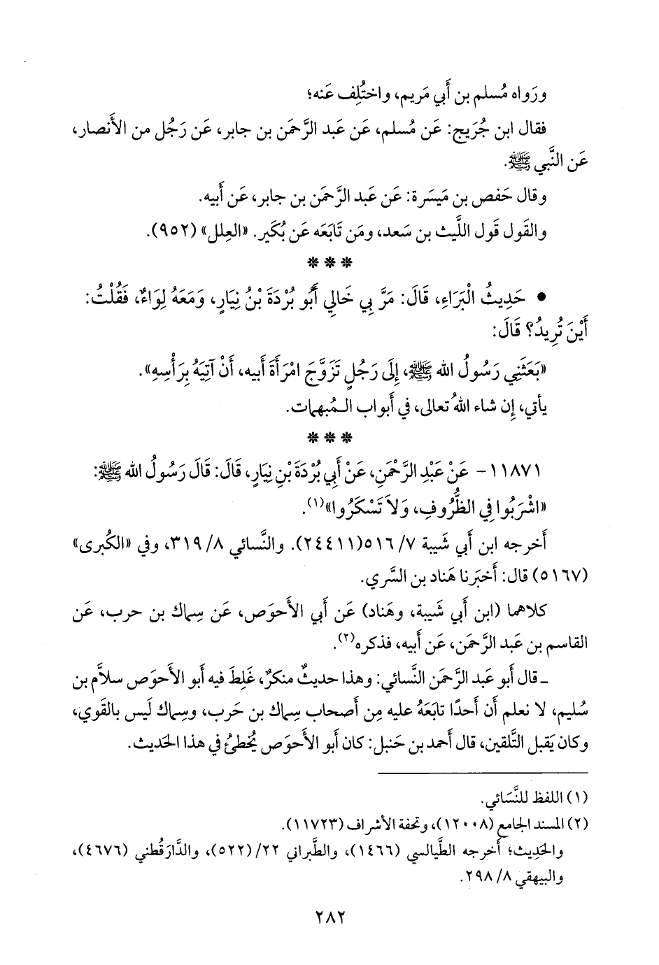 - قال أَبو عبد الرَّحمَن النَّسَائي: وهذا حديثٌ منكرٌ، غلط فيه أَبو الأحوص سلام بن سليم، لا نعلم أن أحدا تابعه عليه من أصحاب سماك بن حرب، وسماك ليس بالقوي، وكان يقبل التلقين، قال أحمد بن حنبل: كان أَبو الأحوص يخطئ في هذا الحديث