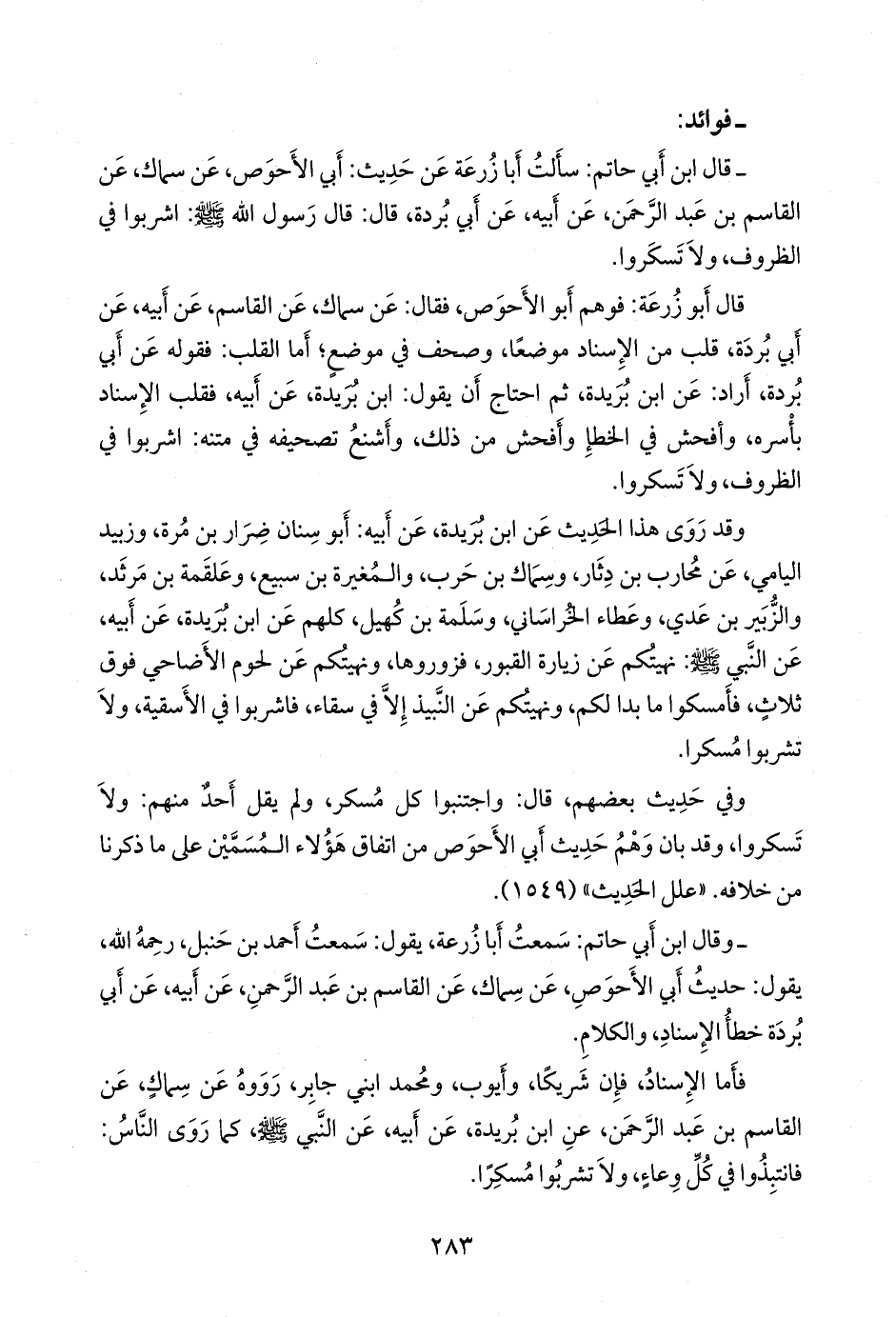 - قال عبد الرَّحمَن بن أبي حاتم الرازي: سألت أَبا زُرعَة عن حديث: أبي الأحوص، عن سِمَاك، عن القاسم بن عبد الرَّحمَن، عن أبيه، عن أبي بردة، قال: قال رسول الله صَلى الله عَليه وسَلم: اشربوا في الظروف، ولا تسكروا.