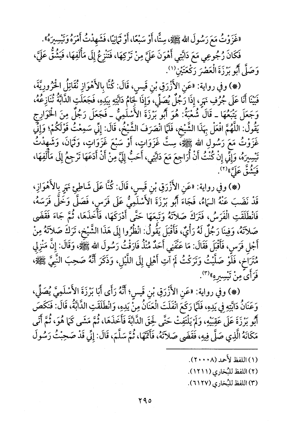 - وفي رواية: «عن الأزرق بن قيس؛ أنه رأى أبا بَرزة الأسلمي يصلي، وعنان دابته في يده، فلما ركع انفلت العنان من يده، وانطلقت الدابة، قال: فنكص أَبو بَرزة على عقبيه، ولم يلتفت حتى لحق الدابة فأخذها، ثم مشى كما هو، ثم أتى مكانه الذي صلى فيه، فقضى صلاته، فأتمها، ثم سلم، قال: إني قد صحبت رسول