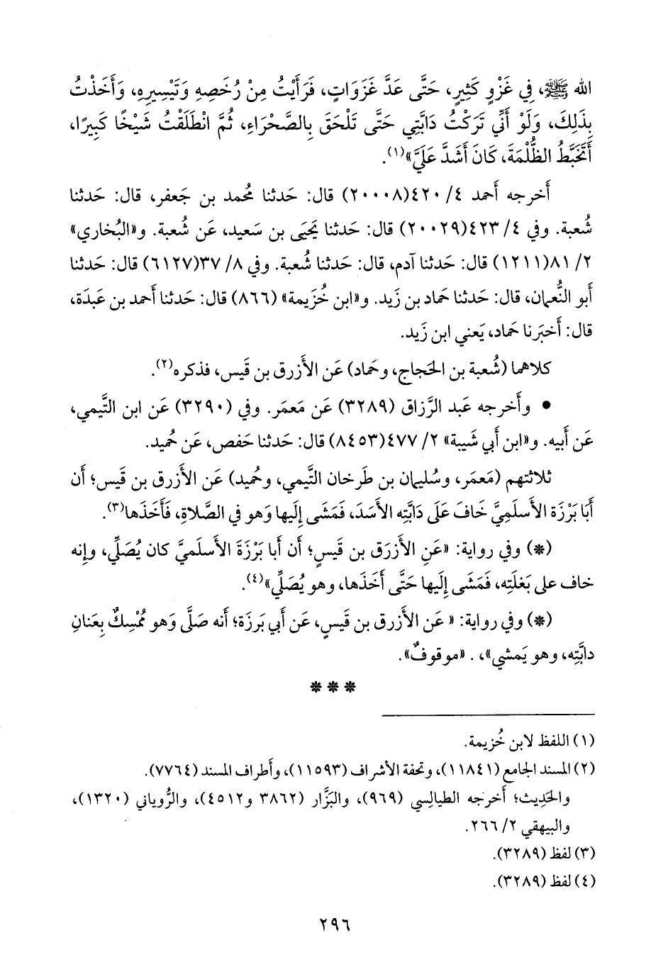 - وفي رواية: «عن الأزرق بن قيس، عن أبي بَرزة؛ أنه صلى وهو ممسك بعنان دابته، وهو يمشي»،. «موقوف».