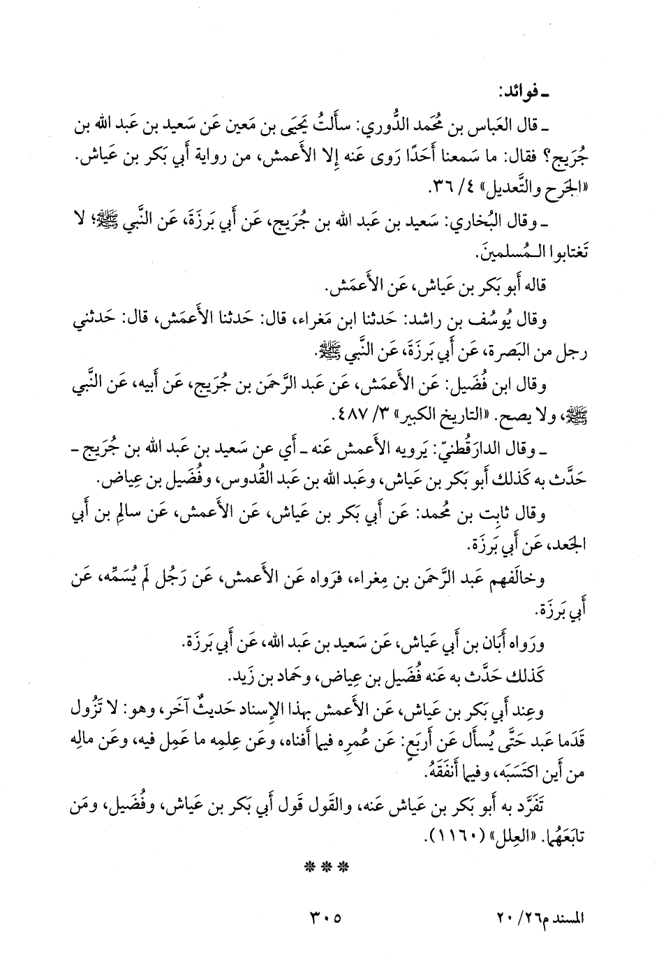 - قال العباس بن محمد الدوري: سألت يحيى بن مَعين عن سعيد بن عبد الله بن جُريج؟ فقال: ما سمعنا أحدا روى عنه إلا الأعمش، من رواية أَبي بكر بن عياش. «الجرح والتعديل» ٤/ ٣٦.