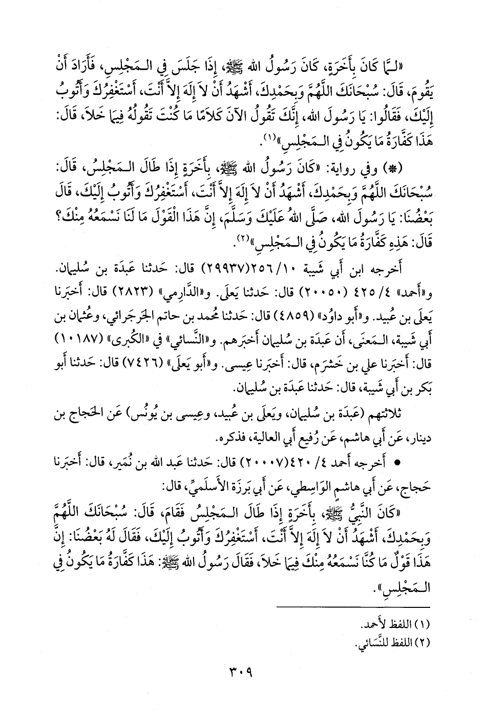 «كان النبي صَلى الله عَليه وسَلم بأخرة إذا طال المجلس فقام، قال: سبحانك اللهم وبحمدك، أشهد أن لا إله إلا أنت، أستغفرك وأتوب إليك، فقال له بعضنا: إن هذا قول ما كنا نسمعه منك فيما خلا، فقال رسول الله صَلى الله عَليه وسَلم: هذا كفارة ما يكون في المجلس».