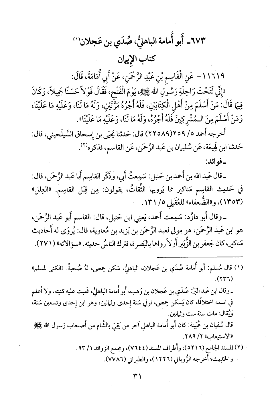 (¬١) قال مسلم: أَبو أمامة صُدَي بن عَجلان، الباهلي، سكن حمص، له صحبة. «الكنى لمسلم» (٢٣٦).