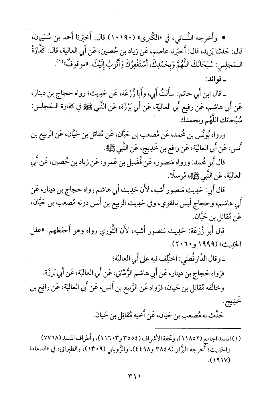 - قال عبد الرَّحمَن بن أبي حاتم الرازي: سألت أبي، وأَبا زُرعَة، عن حديث؛ رواه حجاج بن دينار، عن أبي هاشم، عن رفيع أبي العالية، عن أبي بَرزة، عن النبي صَلى الله عَليه وسَلم في كفارة المجلس: سبحانك اللهم وبحمدك.