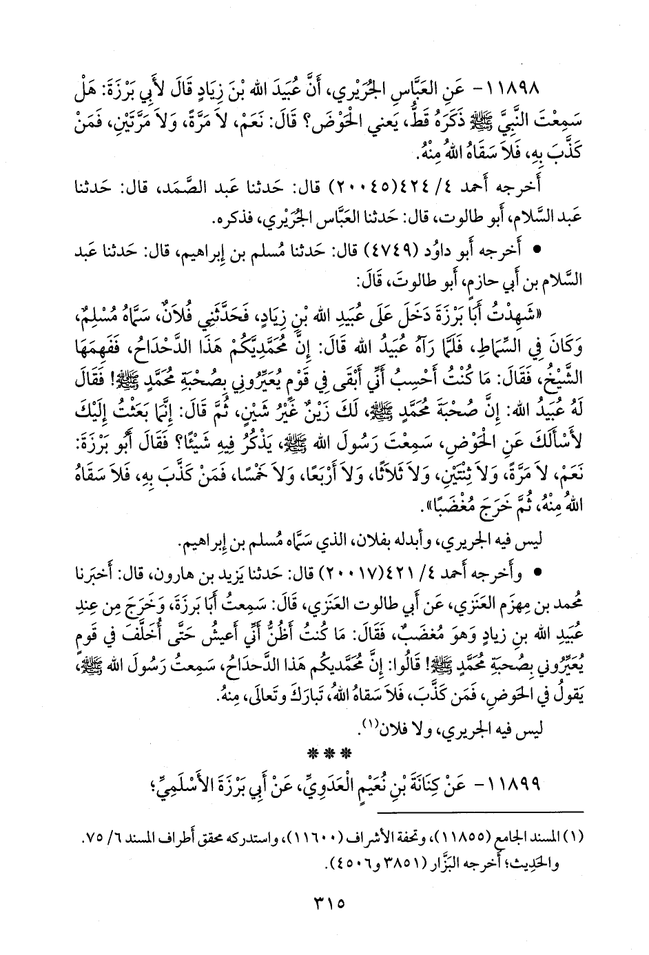 ١١٨٩٩ - عن العباس الجُريري، أن عُبيد الله بن زياد قال لأبي بَرزة: هل سمعتَ النبي صَلى الله عَليه وسَلم ذكره قط، يعني الحوض؟ قال: نعم، لا مرة، ولا مرتين، فمن كذب به، فلا سقاه الله منه.