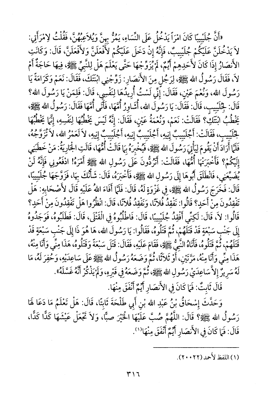 - وفي رواية: «أن النبي صَلى الله عَليه وسَلم كان في مغزى له، فأفاء الله عليه، فقال لأصحابه: هل تفقدون من أحد؟ قالوا: نعم، فلانا وفلانا وفلانا، ثم قال: هل تفقدون من أحد؟ قالوا: نعم، فلانا وفلانا وفلانا، ثم قال: هل تفقدون من أحد؟ قالوا: لا، قال: لكني أفقد جليبيبا، فاطلبوه، فطلب في القتلى، فوجدوه إلى جنب سبعة قد قتلهم، ثم قتلوه، فأتى النبي صَلى الله عَليه وسَلم فوقف عليه، فقال: قتل سبعة ثم قتلوه، هذا مني وأنا منه، هذا مني وأنا منه، قال: فوضعه على ساعديه، ليس له إلا ساعدا النبي صَلى الله عَليه وسَلم قال: فحفر له ووضع في قبره، ولم يذكر غسلا» (¬٢).