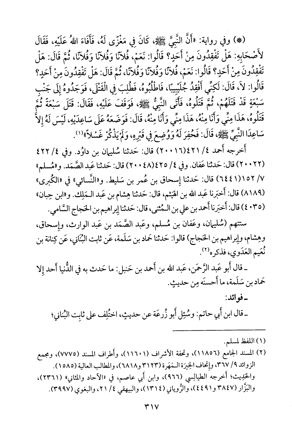 ستتهم (سليمان، وعفان بن مسلم، وعبد الصمد بن عبد الوارث، وإسحاق، وهشام، وإبراهيم بن الحجاج) عن حماد بن سلمة، عن ثابت البُنَاني، عن كنانة بن نعيم العدوي، فذكره (¬١).